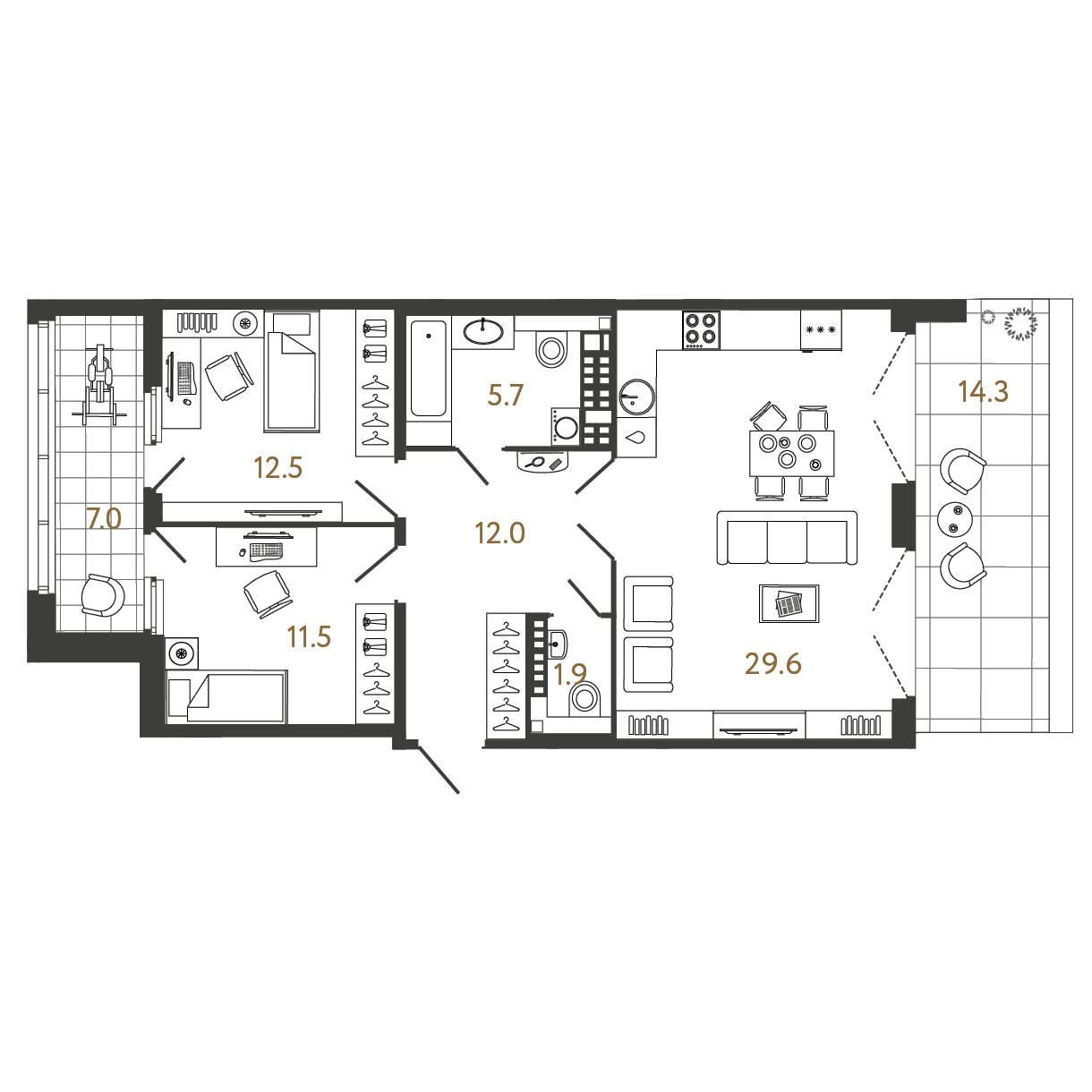 Площадь: 73.2 / 24 / 29.6