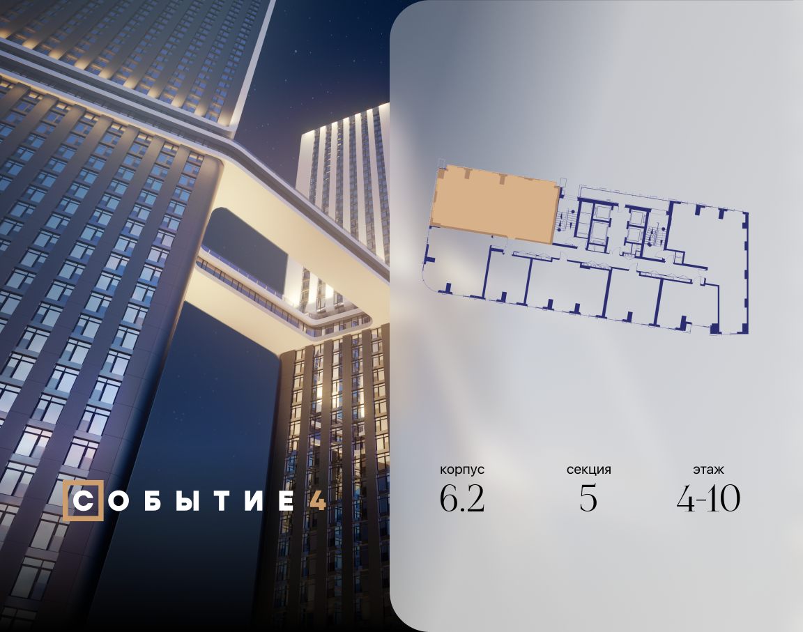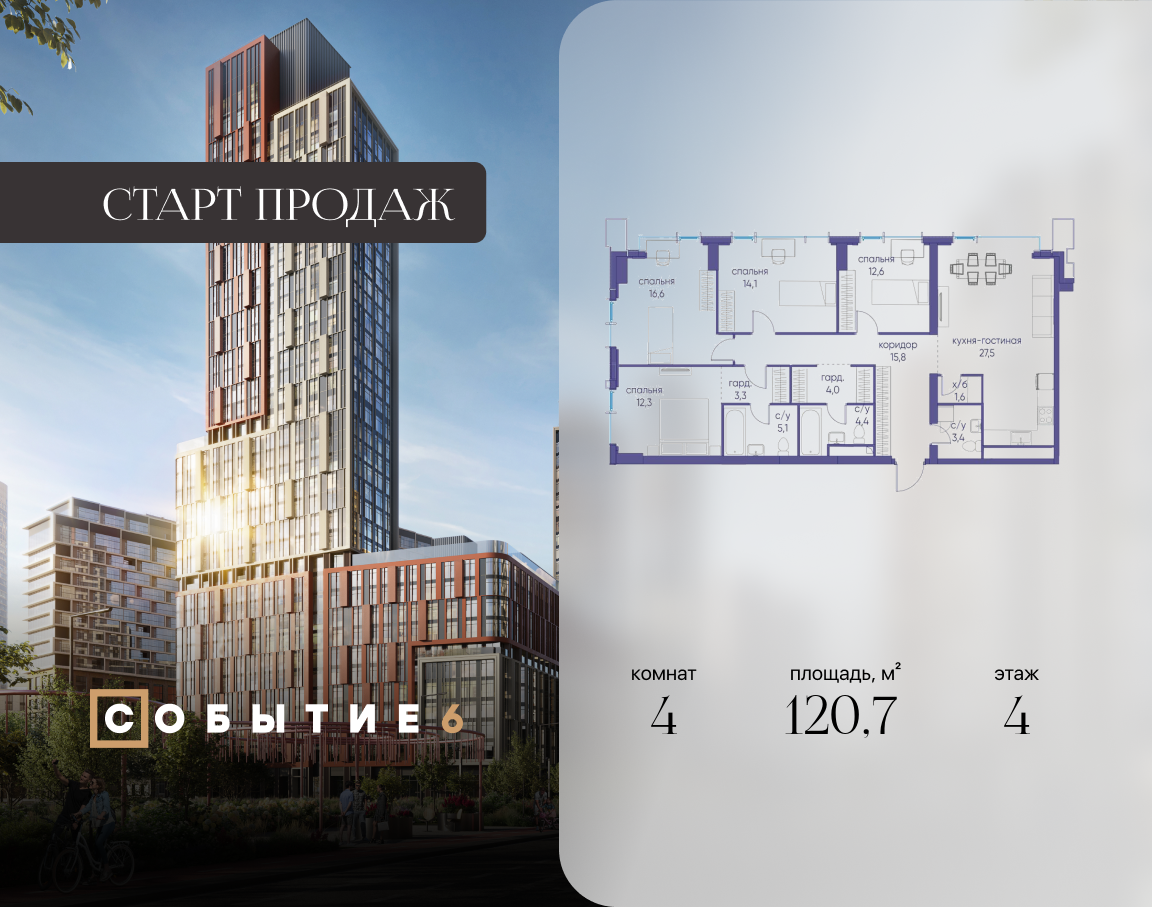 Продаётся 4-комнатная квартира от застройщика: общая площадь 120.70 м², жилая 55.60 м², кухня 27.50 м², 4-й этаж, жилой квартал «Событие-6», корпус 2 (секция 5) Срок сдачи: 1 квартал 2029 года.