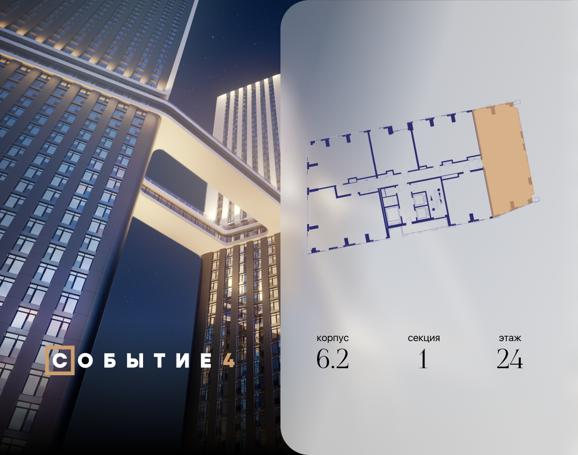 Продаётся 4-комнатная квартира от застройщика: общая площадь 111.50 м², жилая 54.90 м², кухня 24.00 м², 24-й этаж, жилой квартал «Событие-6», корпус 2 (секция 1) Срок сдачи: 1 квартал 2029 года.