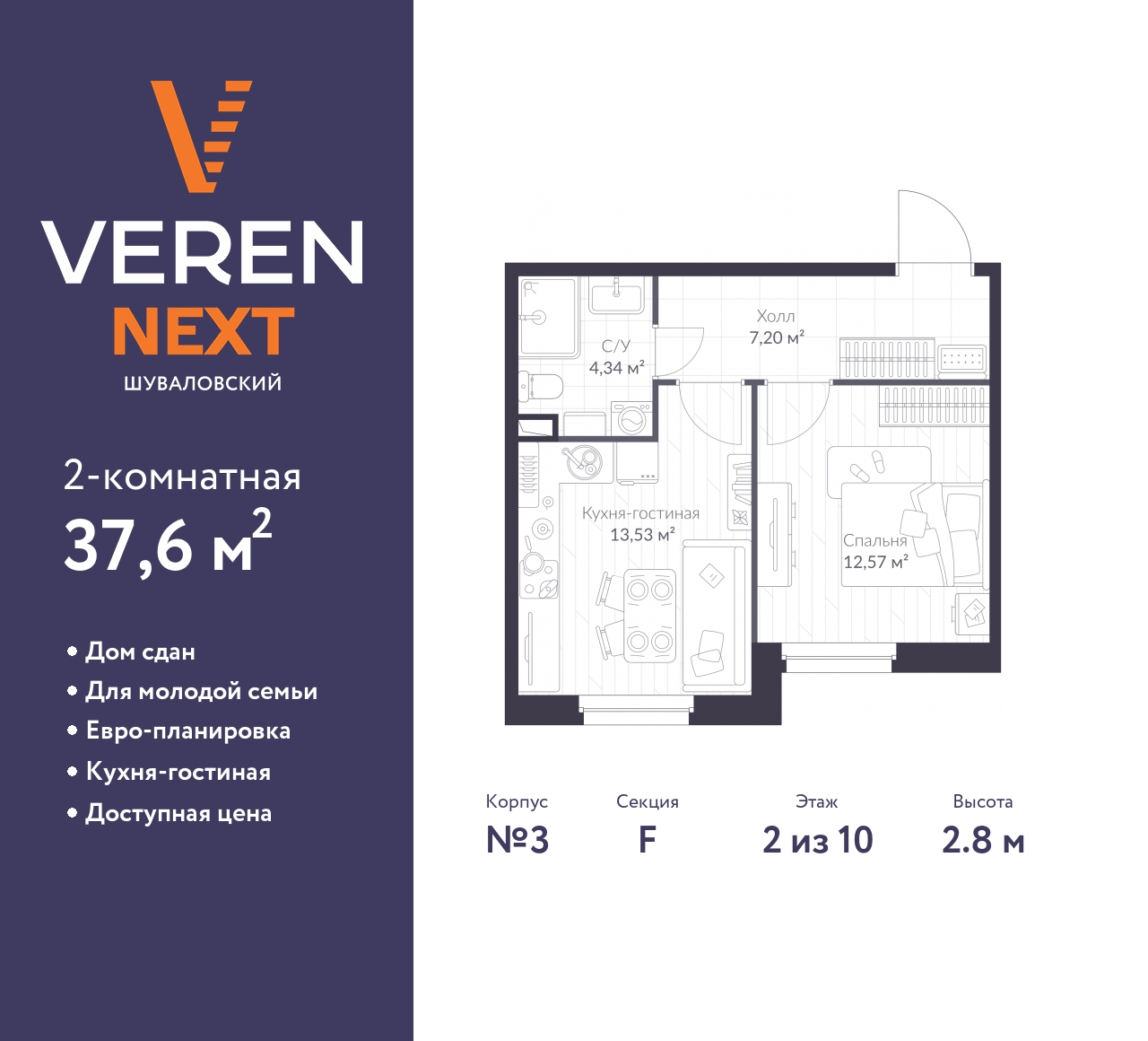 1-комн. квартира в ЖК "VEREN NEXT Шуваловский" на 2 этаже. Квартира без отделки, после оформления собственности можно делать ремонт. Общая площадь: 37.6 кв.м., жилая: 12.57 кв.м., площадь просторной куxни-гостиной: 13.53 кв.м. Все окна выходят на одну сторону. В квартире один совмещенный санузел. Высота потолков 2.8 м.