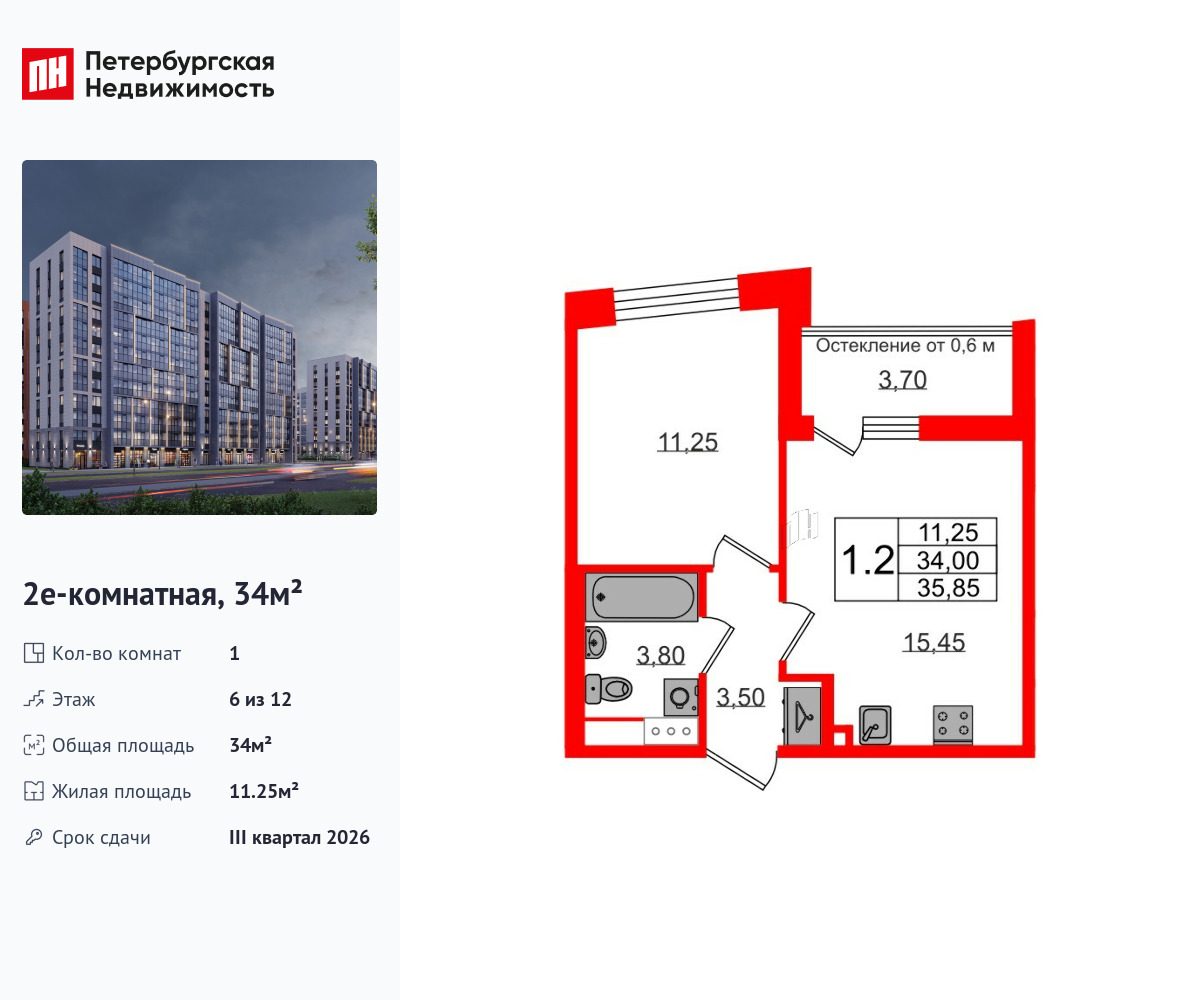 Удобная, классическая, функциональная европланировка, большая кухня-гостиная 15.45 м², вместительная прихожая 3.5 м². Общая площадь квартиры - 34 м², жилая – 11.25 м², высота потолка 2.77 м.