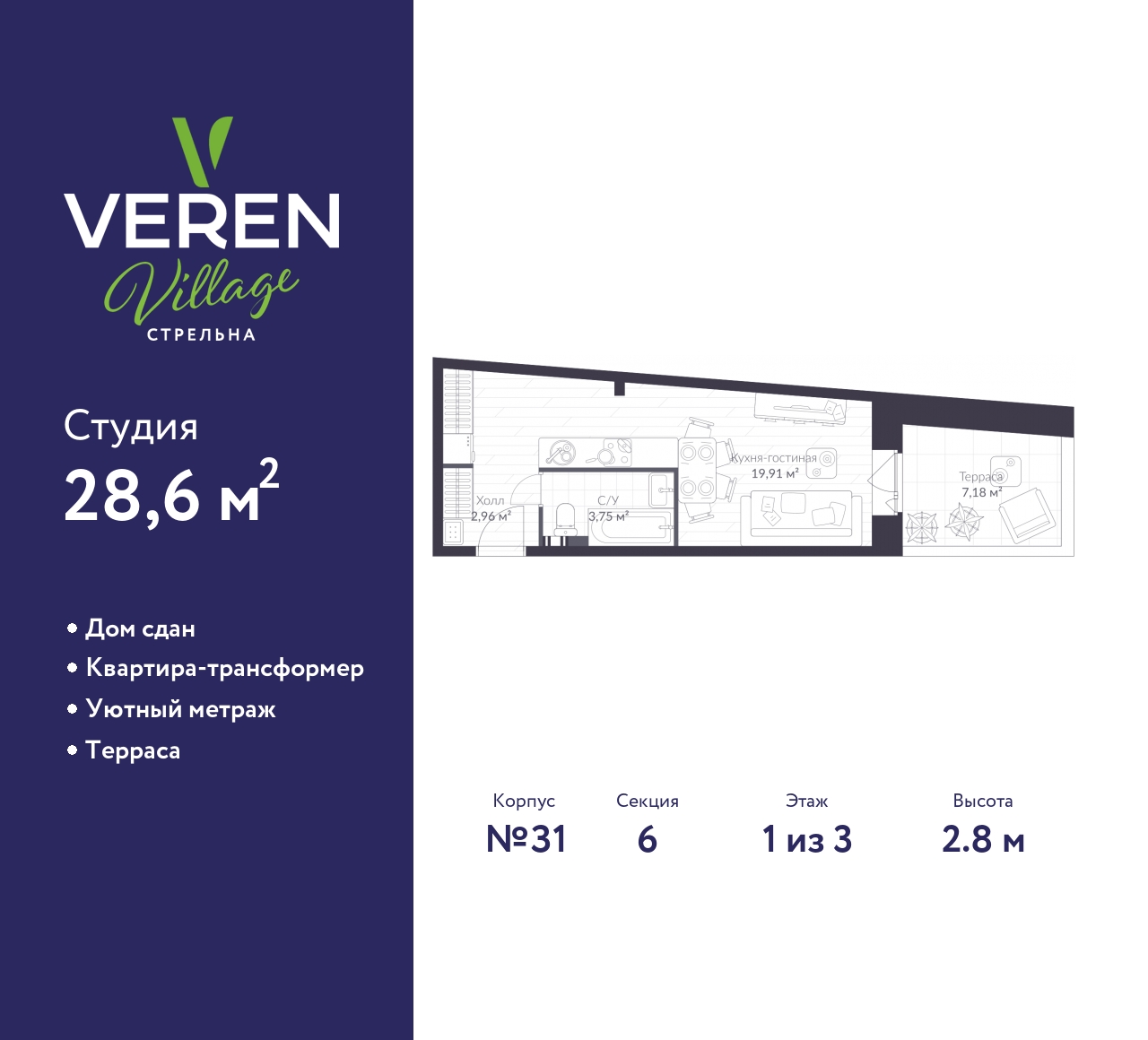 Однокомнатная квартира-студия в ЖК "VEREN VILLAGE Стрельна" на 1 этаже. Квартира без отделки, новый владелец может сделать ремонт по своему дизайн-проекту. Общая площадь: 28.6 кв.м., площадь гостиной 19.91 кв.м., из которых 5 кв.м. выделено под кухонную зону. Все окна выходят на одну сторону. В квартире один балкон, один совмещенный санузел. Терраса представляет собой роскошную зону отдыха, где вы на свой вкус можете создать атмосферу комфорта и уюта. Высота потолков 2.8 м.