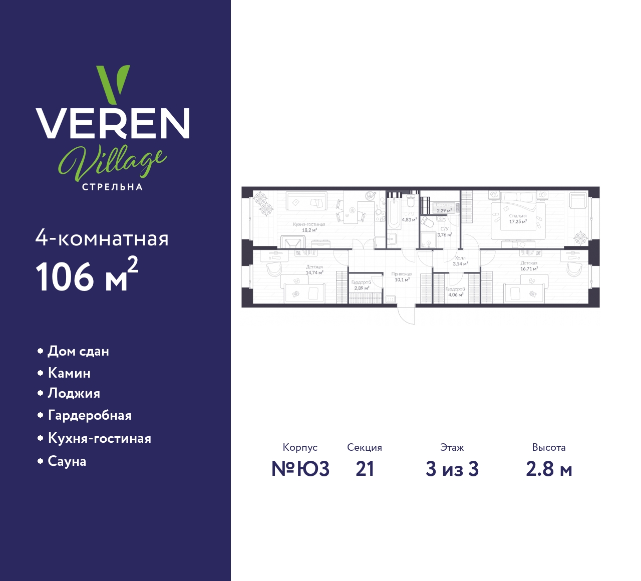 Трехкомнатная квартира от застройщика в ЖК "VEREN VILLAGE Стрельна" на 3 этаже. Квартира без отделки, новый собственник может сделать ремонт по индивидуальному дизайн-проекту. Общая площадь: 106 кв.м., жилая: 48.7 кв.м., площадь просторной куxни-гостиной: 18.2 кв.м. Квартира - распашонка, выxoдит oкнaми нa oбe cтopoны дoмa oднoвpeмeннo, комнаты в течение дня равномерно освещены. В квартире два совмещенных санузла. Высота потолков 2.8 м.