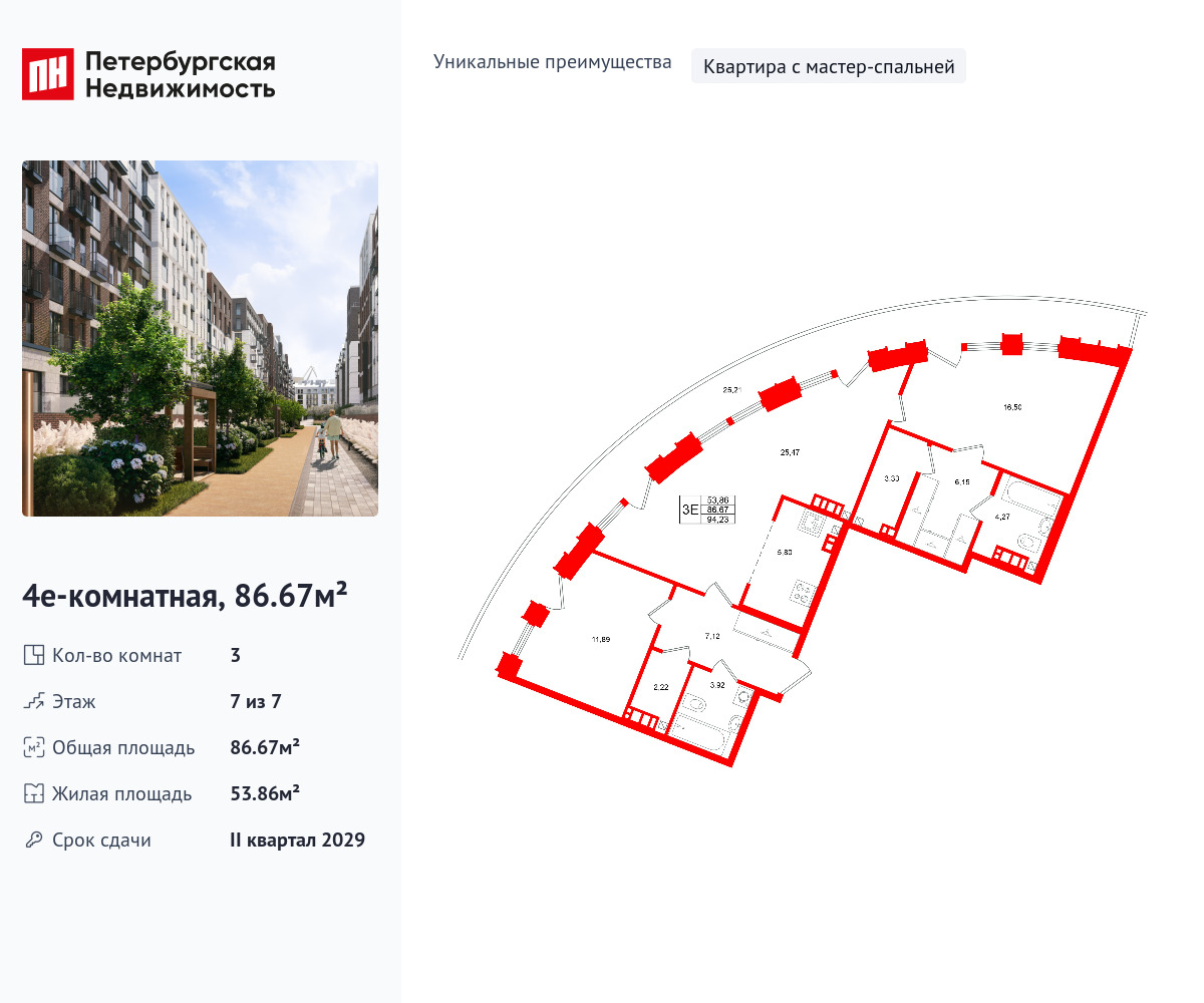 Уникальная, функциональная европланировка, вместительная прихожая 7.12 м². Общая площадь квартиры - 86.67 м², жилая – 53.86 м², высота потолка 3.6 м.