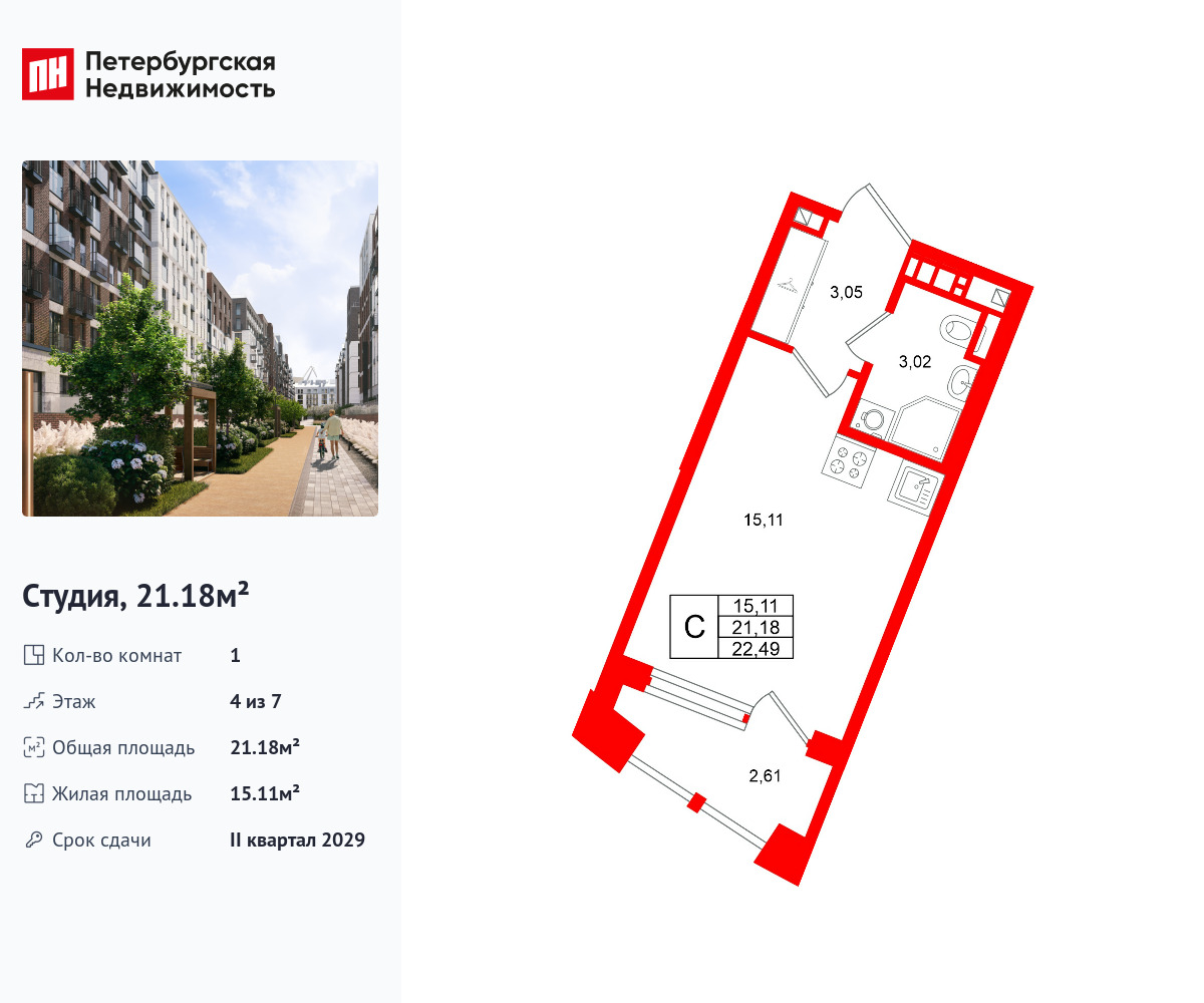 Удобная, классическая, функциональная европланировка, вместительная прихожая 3.05 м². Общая площадь студии - 21.18 м², жилая – 15.11 м², высота потолка 3 м.
