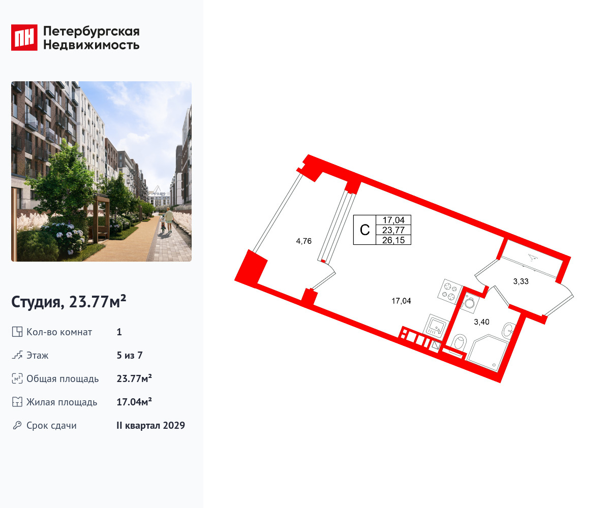 Удобная, классическая, функциональная европланировка, просторная прихожая 3.33 м². Общая площадь студии - 23.77 м², жилая – 17.04 м², высота потолка 3 м.