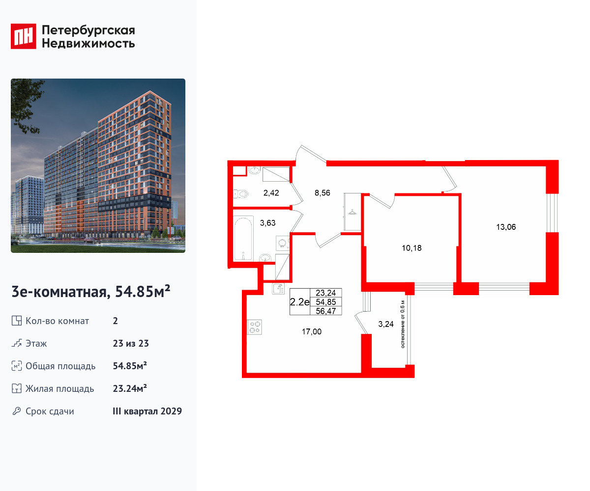 Удобная, классическая, функциональная европланировка, большая кухня-гостиная 17 м², просторная прихожая 8.56 м². Общая площадь квартиры - 54.85 м², жилая – 23.24 м², высота потолка 3 м.