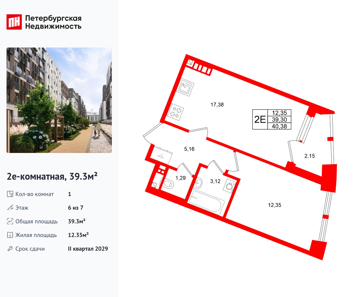 Удобная, классическая, функциональная европланировка, большая кухня-гостиная 17.38 м², просторная прихожая 5.16 м². Общая площадь квартиры - 39.3 м², жилая – 12.35 м², высота потолка 2.98 м.