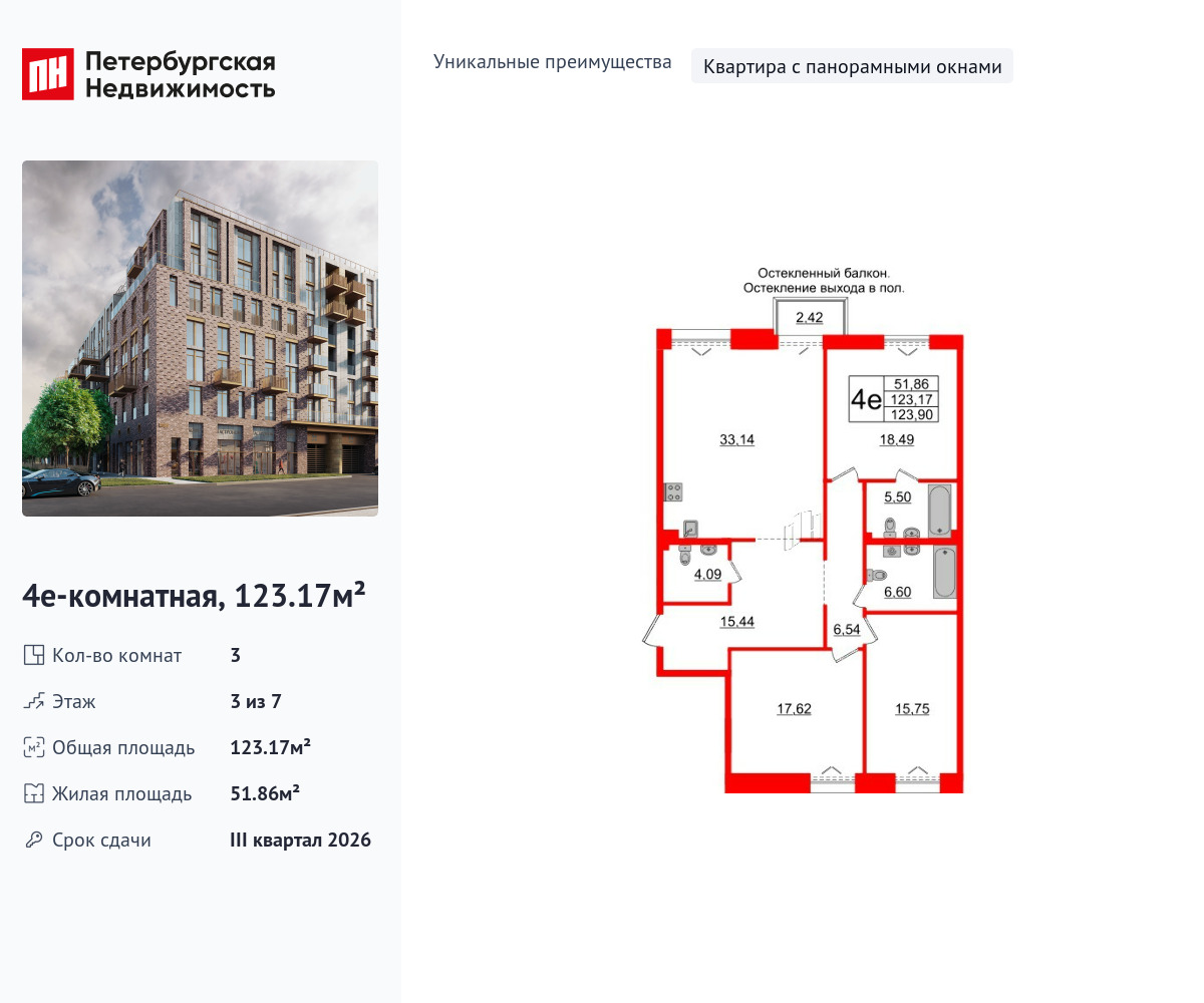 Уникальная, функциональная европланировка, большая кухня-гостиная 33.14 м², просторная прихожая 15.44 м². Общая площадь квартиры - 123.17 м², жилая – 51.86 м², высота потолка 3 м.