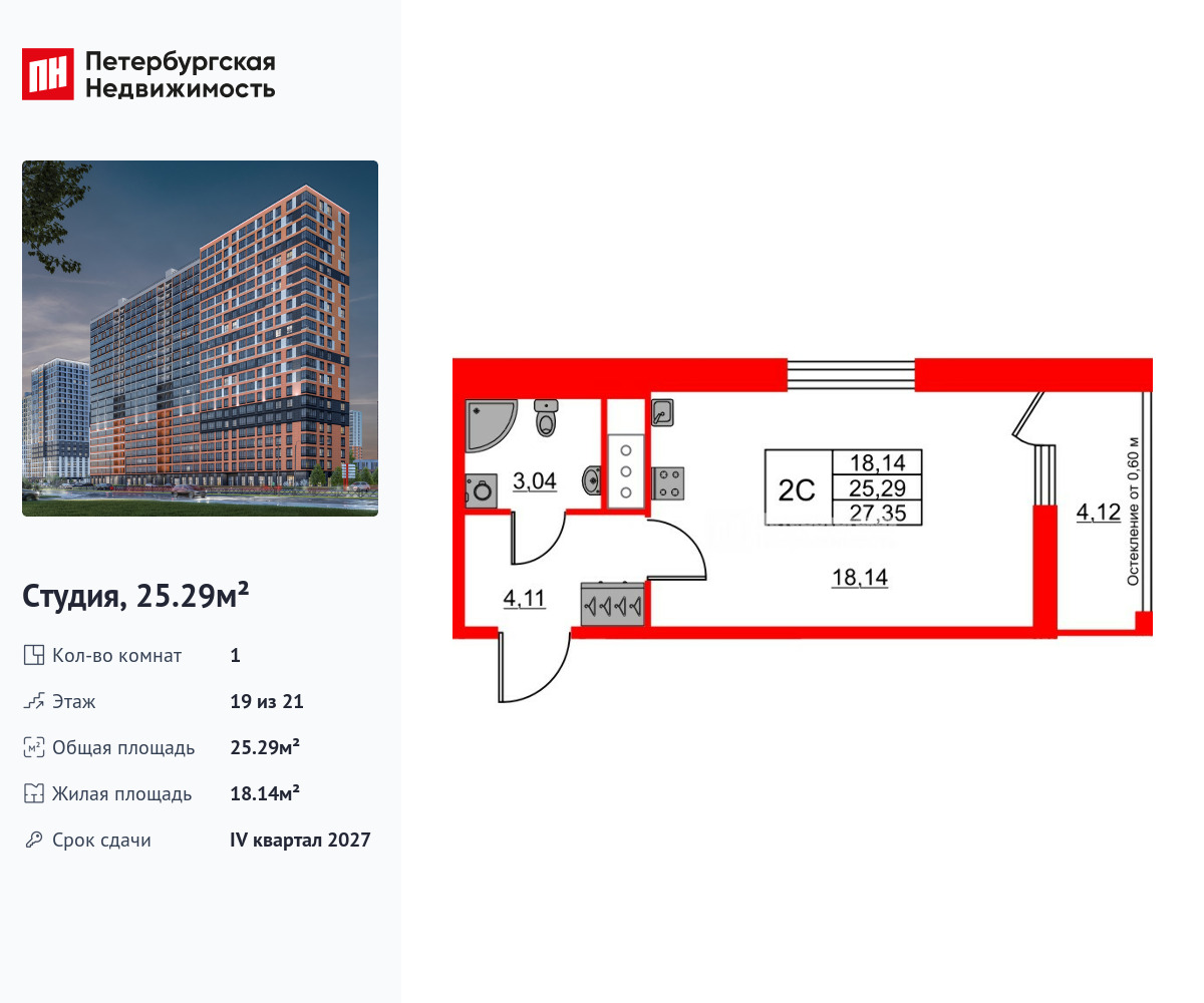 Удобная, классическая, функциональная европланировка, просторная прихожая 4.11 м². Общая площадь студии - 25.29 м², жилая – 18.14 м², высота потолка 2.77 м.