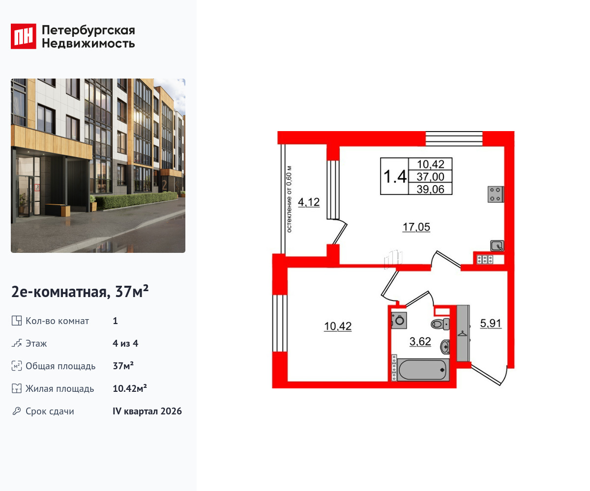 Удобная, классическая, функциональная европланировка, большая кухня-гостиная 17.05 м², просторная прихожая 5.91 м². Общая площадь квартиры - 37 м², жилая – 10.42 м², высота потолка 3.07 м.