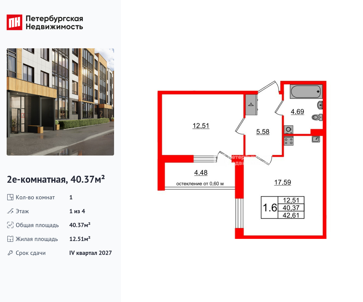 Удобная, классическая, функциональная европланировка, большая кухня-гостиная 17.59 м², просторная прихожая 5.58 м². Общая площадь квартиры - 40.37 м², жилая – 12.51 м², высота потолка 2.77 м.