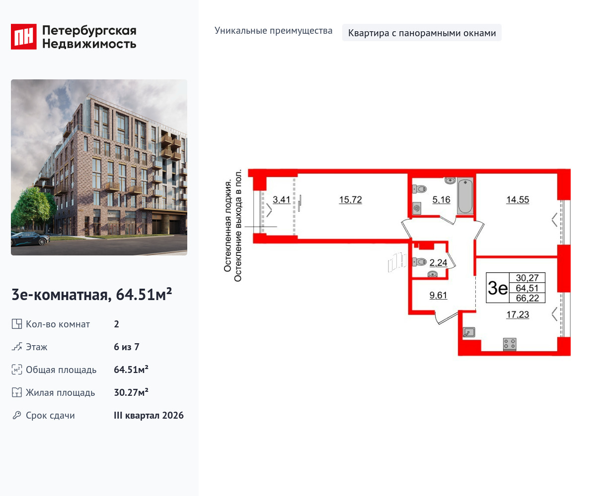 Уникальная, функциональная европланировка, большая кухня-гостиная 17.23 м², просторная прихожая 9.61 м². Общая площадь квартиры - 64.51 м², жилая – 30.27 м², высота потолка 3 м.