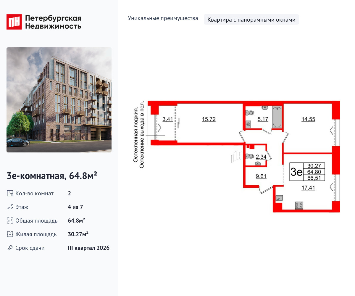 Уникальная, функциональная европланировка, большая кухня-гостиная 17.41 м², просторная прихожая 9.61 м². Общая площадь квартиры - 64.8 м², жилая – 30.27 м², высота потолка 3 м.