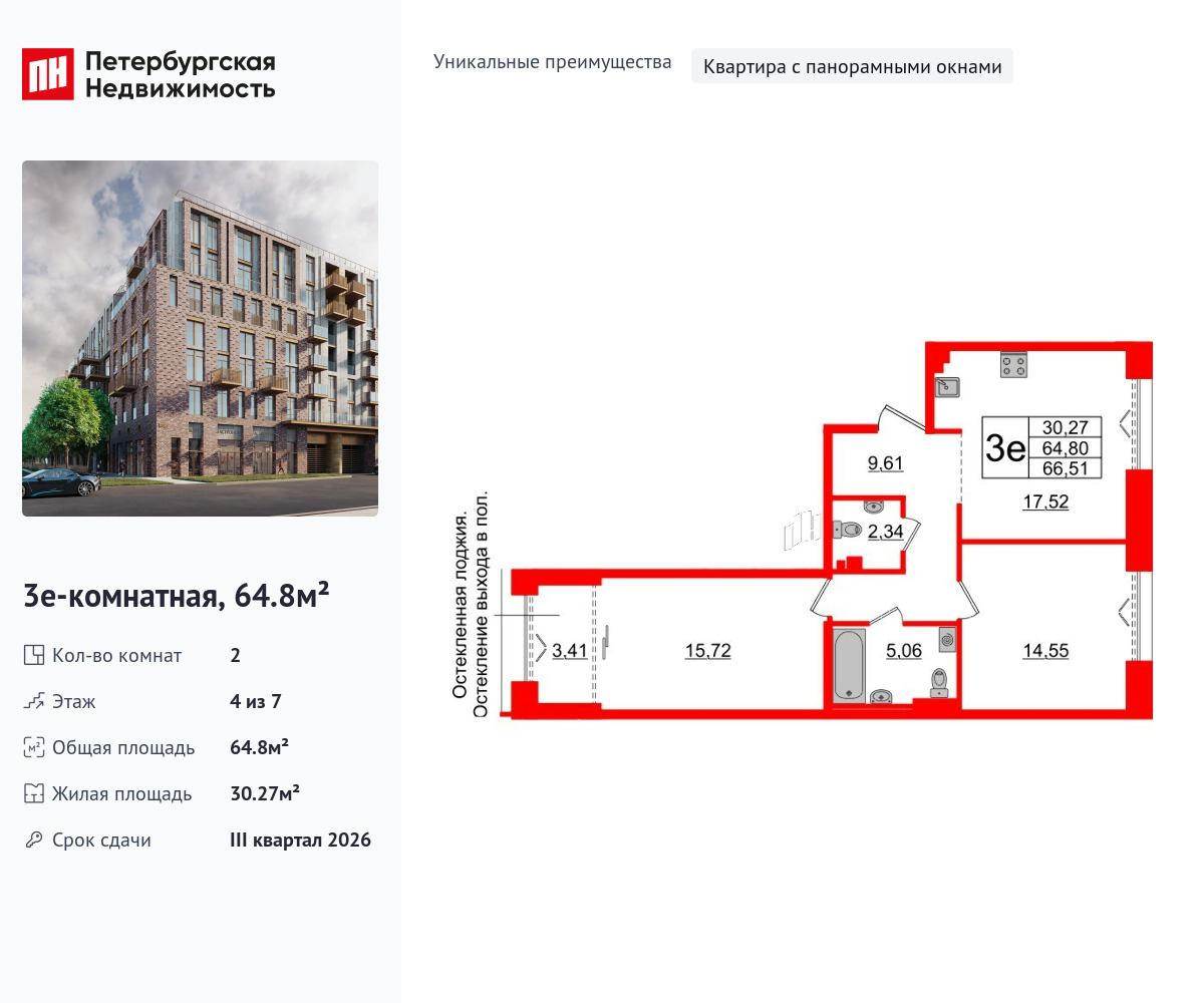Уникальная, функциональная европланировка, большая кухня-гостиная 17.52 м², просторная прихожая 9.61 м². Общая площадь квартиры - 64.8 м², жилая – 30.27 м², высота потолка 3 м.
