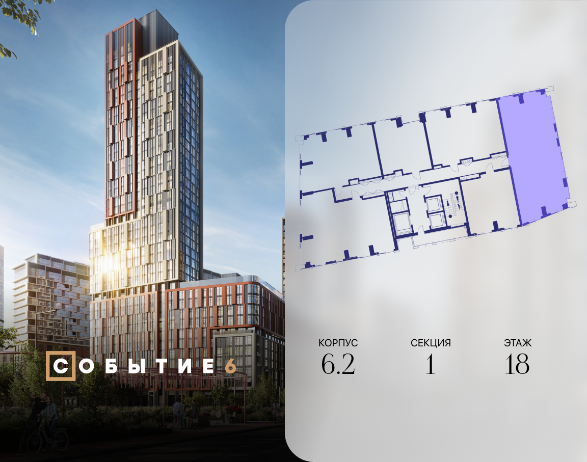 Продаётся 4-комнатная квартира от застройщика: общая площадь 111.20 м², жилая 54.50 м², кухня 24.00 м², 18-й этаж, жилой квартал «Событие-6», корпус 2 (секция 1) Срок сдачи: 1 квартал 2029 года.