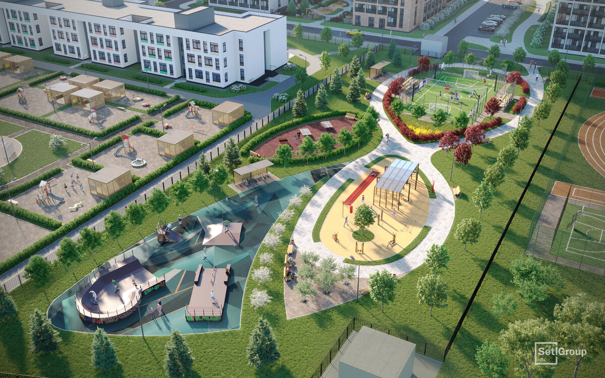 • Места притяжения: фонтан "Бионика", спортивный кластер со скейт-парком, фотозоны с арт-объектами