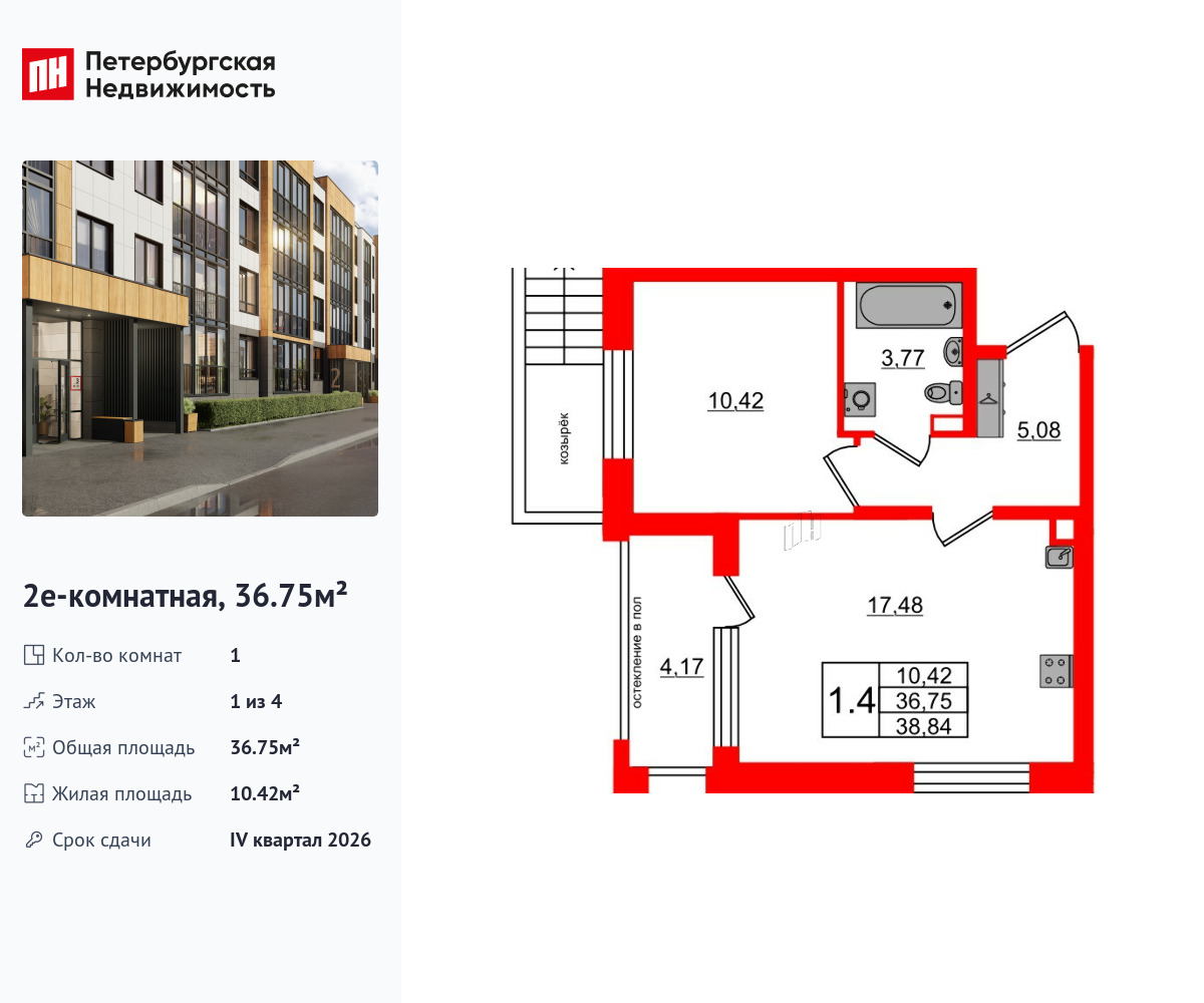 Удобная, классическая, функциональная европланировка, большая кухня-гостиная 17.48 м², просторная прихожая 5.08 м². Общая площадь квартиры - 36.75 м², жилая – 10.42 м², высота потолка 2.77 м.
