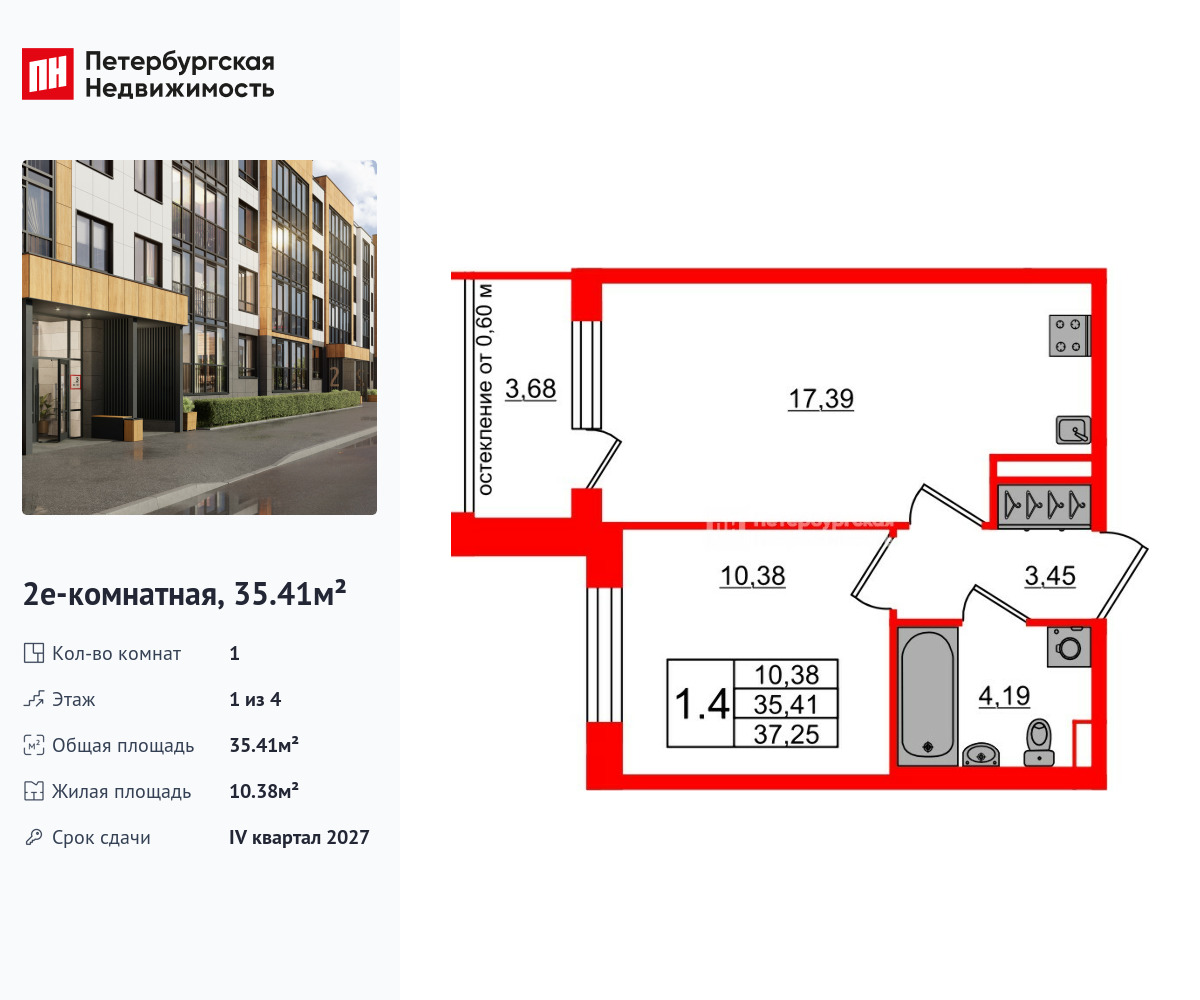 Удобная, классическая, функциональная европланировка, большая кухня-гостиная 17.39 м², вместительная прихожая 3.45 м². Общая площадь квартиры - 35.41 м², жилая – 10.38 м², высота потолка 2.77 м.