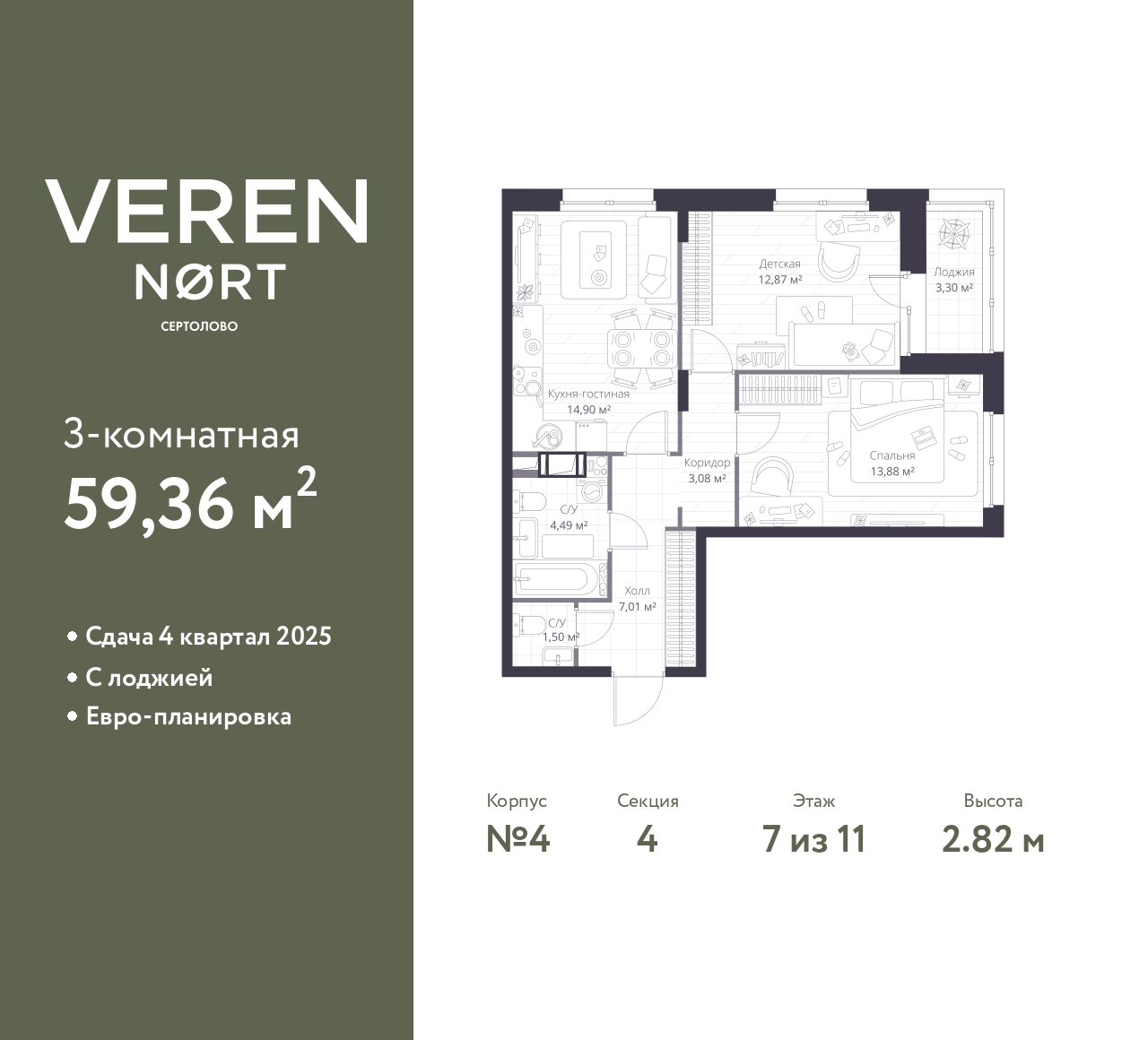 Двухкомнатная квартира в Veren Nort Сертолово на 7 этаже. Квартира без отделки, после получения ключей можно делать ремонт. Общая площадь: 59.36 кв.м., жилая: 26.75 кв.м., площадь просторной куxни-гостиной: 14.9 кв.м. Угловая квартира, окна oбecпeчивaют paвнoмepнoe ocвeщeниe в тeчeниe дня. В квартире одна лоджия, один совмещенный и один раздельный санузел. Высота потолков 2.82 м.
