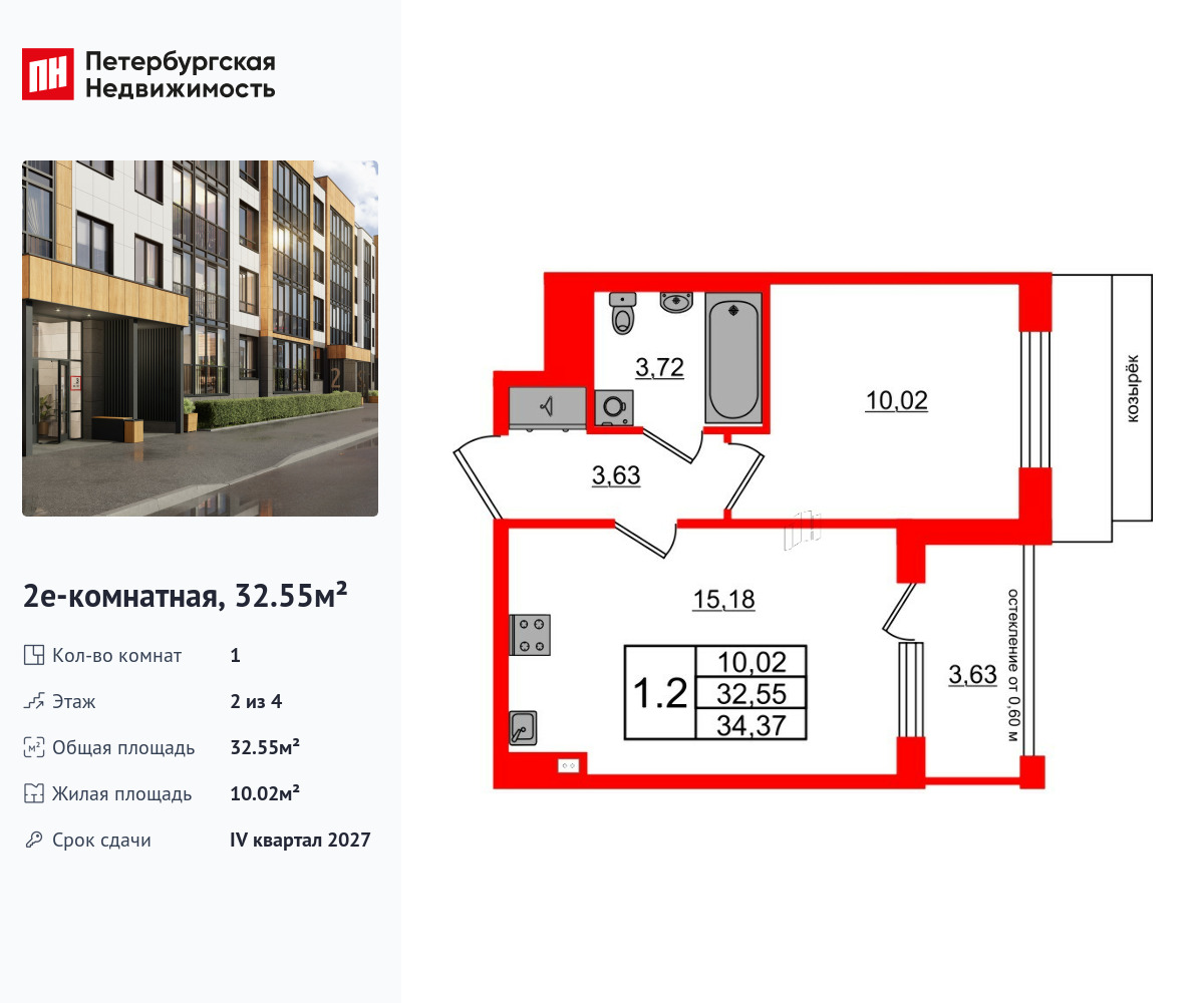 Удобная, классическая, функциональная европланировка, большая кухня-гостиная 15.18 м², вместительная прихожая 3.63 м². Общая площадь квартиры - 32.55 м², жилая – 10.02 м², высота потолка 2.77 м.