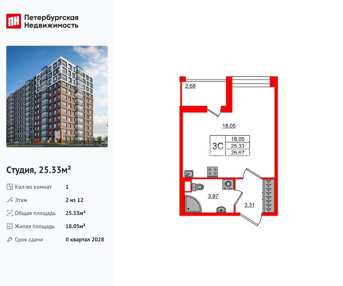 Удобная, классическая, функциональная европланировка, просторная прихожая 3.31 м². Общая площадь студии - 25.33 м², жилая – 18.05 м², высота потолка 2.77 м.