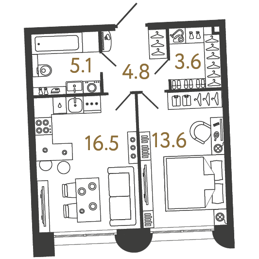 Площадь: 43.6 / 13.6 / 16.5