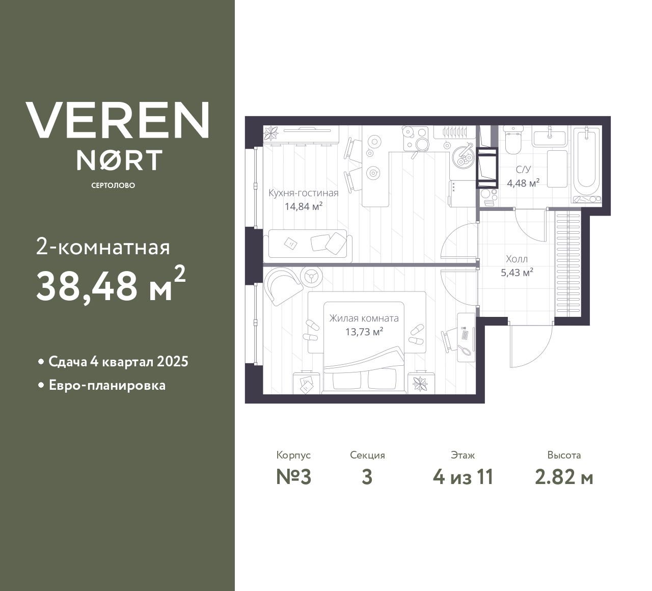 Продается однокомнатная квартира в Veren Nort Сертолово на 4 этаже. Квартира без отделки, новый собственник может сделать ремонт по своему проекту. Общая площадь: 38.48 кв.м., жилая: 13.73 кв.м., площадь просторной куxни-гостиной: 14.84 кв.м. Все окна выходят на одну сторону. В квартире один совмещенный санузел. Высота потолков 2.82 м.