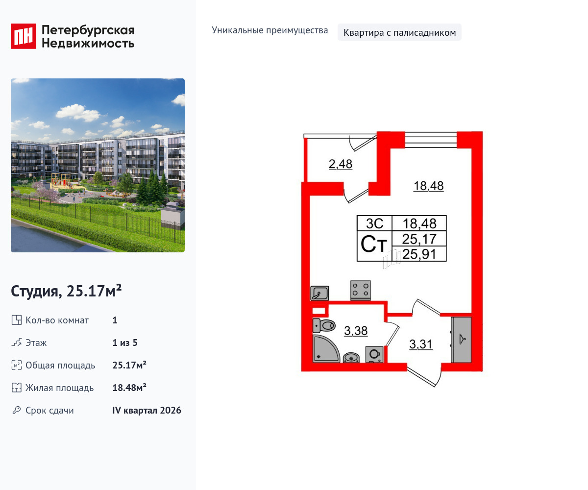 Уникальная, функциональная европланировка, просторная прихожая 3.31 м². Общая площадь студии - 25.17 м², жилая – 18.48 м², высота потолка 2.77 м.