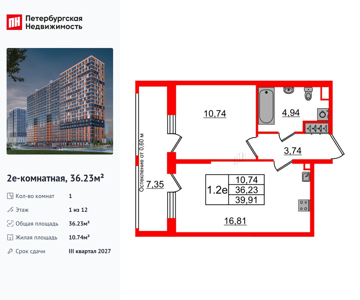 Удобная, классическая, функциональная европланировка, большая кухня-гостиная 16.81 м², вместительная прихожая 3.74 м². Общая площадь квартиры - 36.23 м², жилая – 10.74 м², высота потолка 2.77 м.