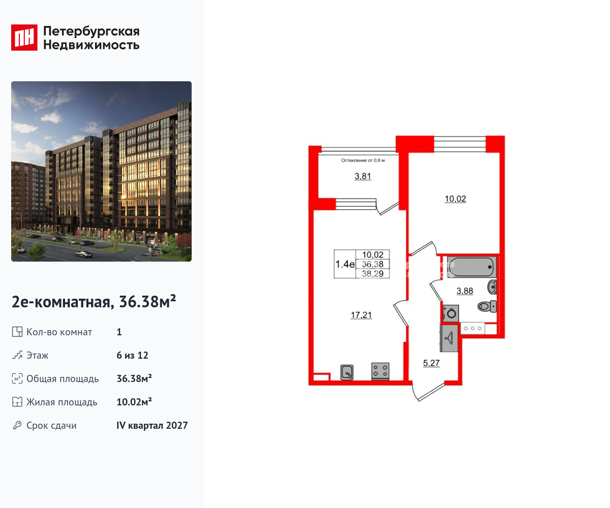 Удобная, классическая, функциональная европланировка, большая кухня-гостиная 17.21 м², просторная прихожая 5.27 м². Общая площадь квартиры - 36.38 м², жилая – 10.02 м², высота потолка 2.75 м.