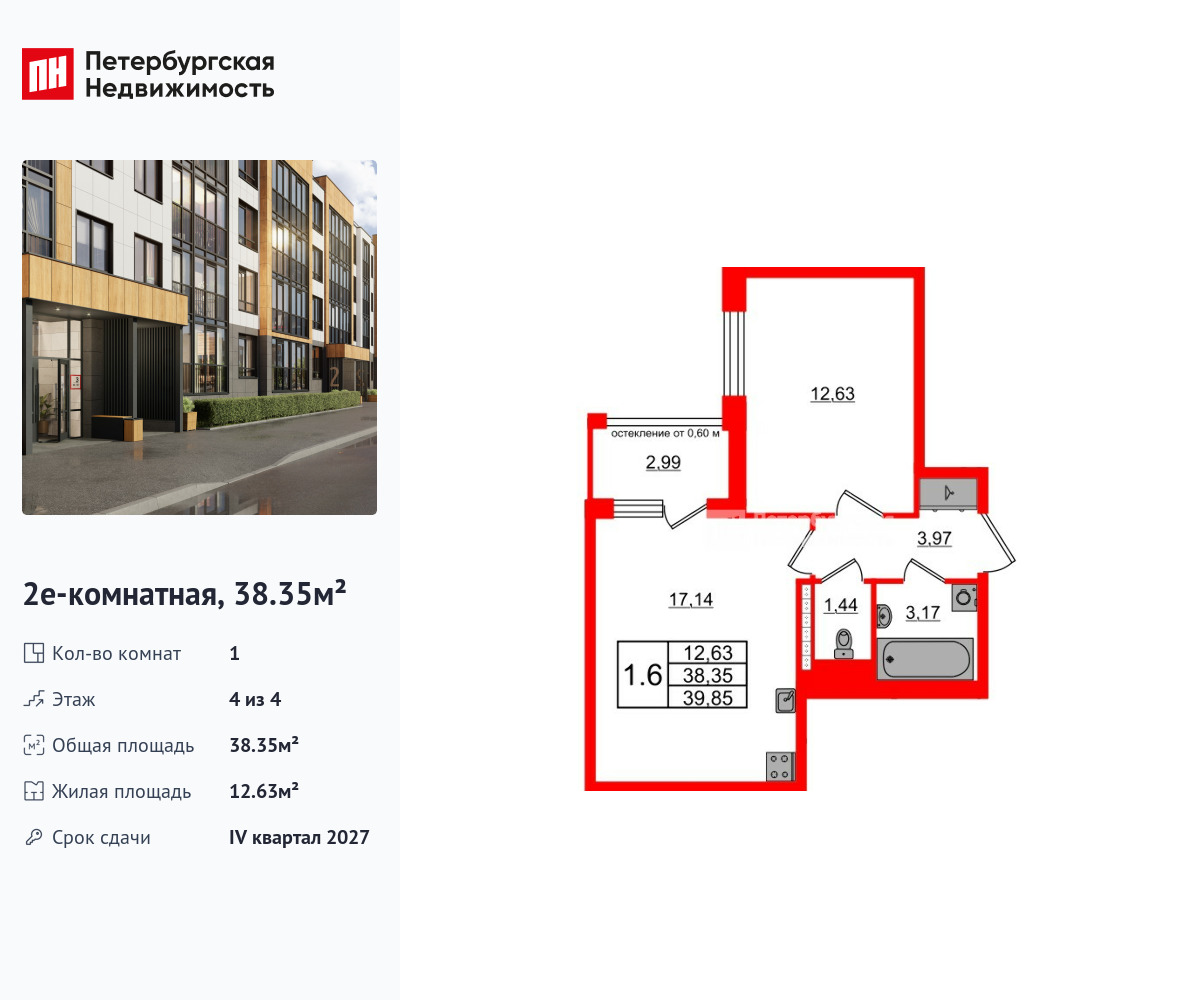 Удобная, классическая, функциональная европланировка, большая кухня-гостиная 17.14 м², вместительная прихожая 3.97 м². Общая площадь квартиры - 38.35 м², жилая – 12.63 м², высота потолка 3.07 м.