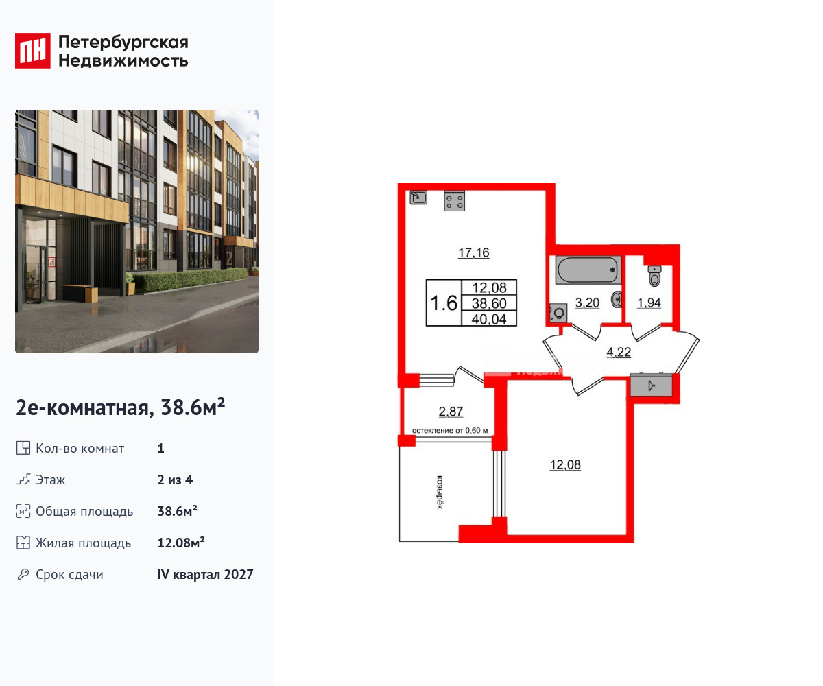 Удобная, классическая, функциональная европланировка, большая кухня-гостиная 17.16 м², вместительная прихожая 4.22 м². Общая площадь квартиры - 38.6 м², жилая – 12.08 м², высота потолка 2.77 м.