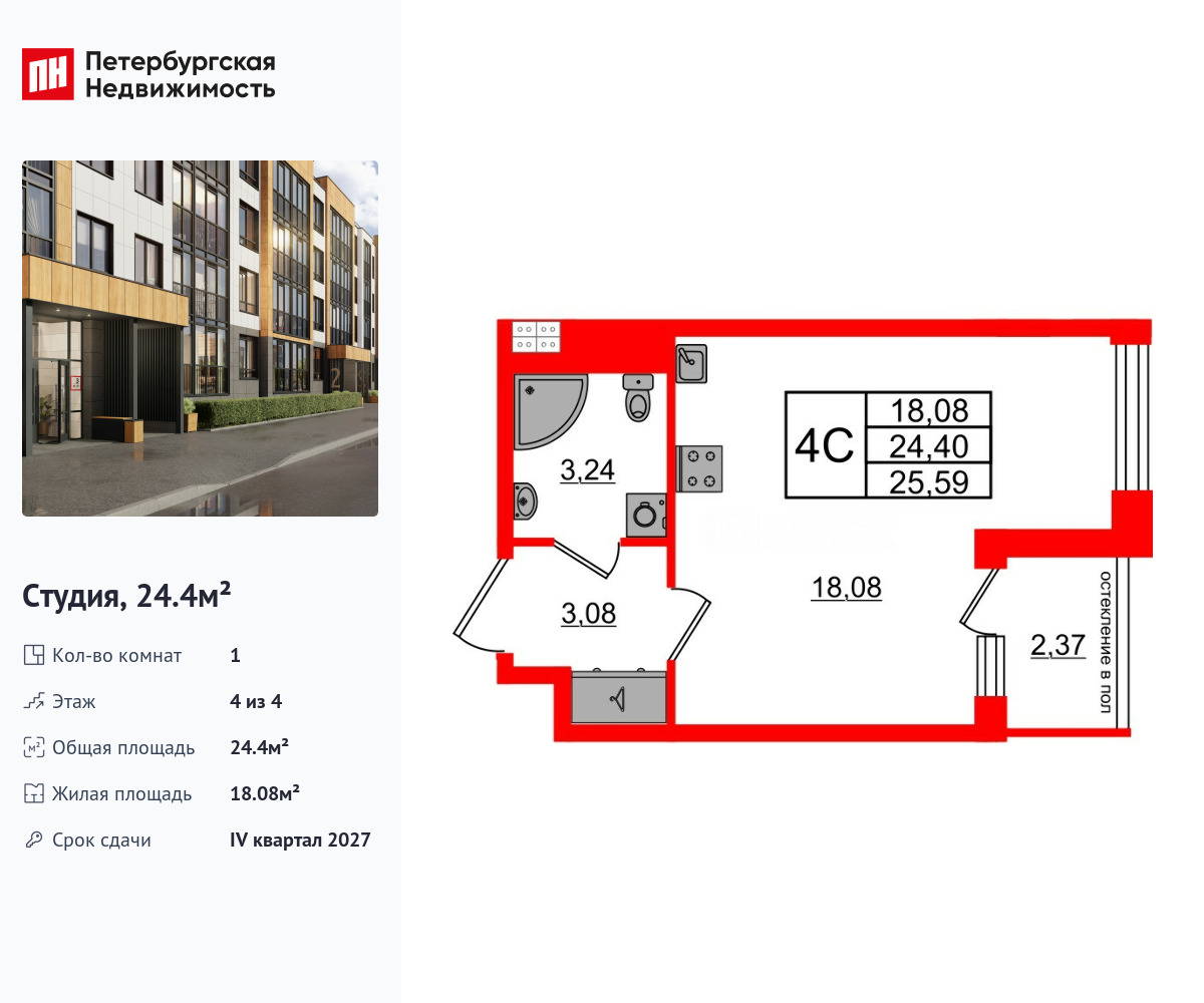 Удобная, классическая, функциональная европланировка, вместительная прихожая 3.08 м². Общая площадь студии - 24.4 м², жилая – 18.08 м², высота потолка 3.07 м.