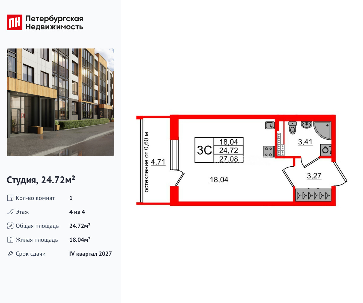 Удобная, классическая, функциональная европланировка, просторная прихожая 3.27 м². Общая площадь студии - 24.72 м², жилая – 18.04 м², высота потолка 3.07 м.