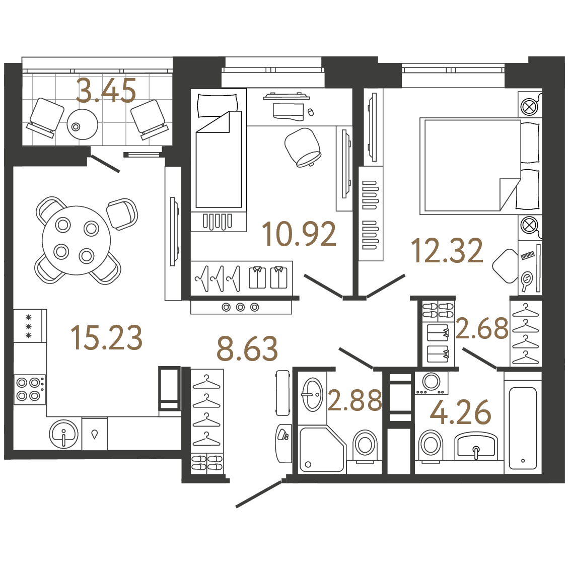 Площадь: 56.92 / 23.24 / 15.23