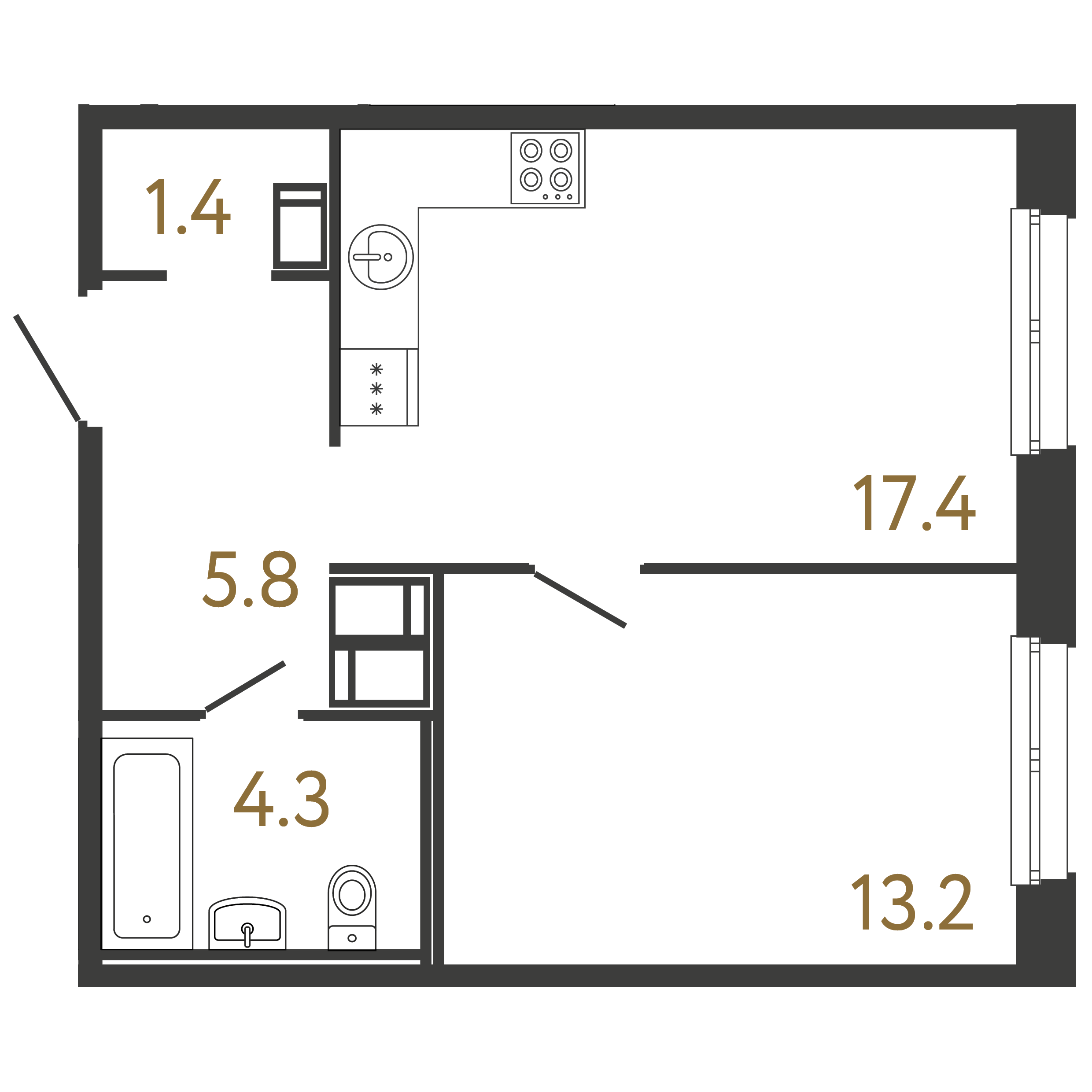Площадь: 42.1 / 13.2 / 17.4