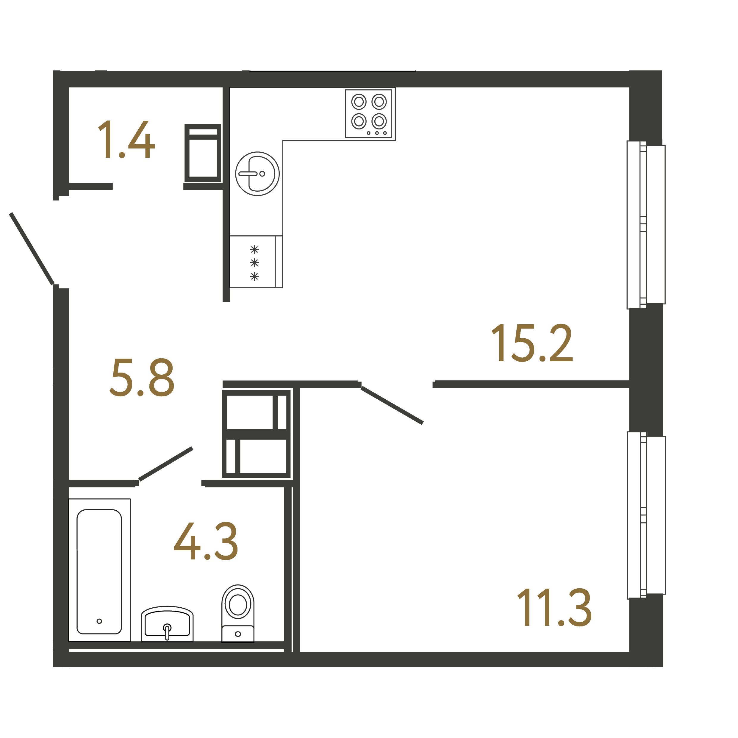 Площадь: 38 / 11.3 / 15.2