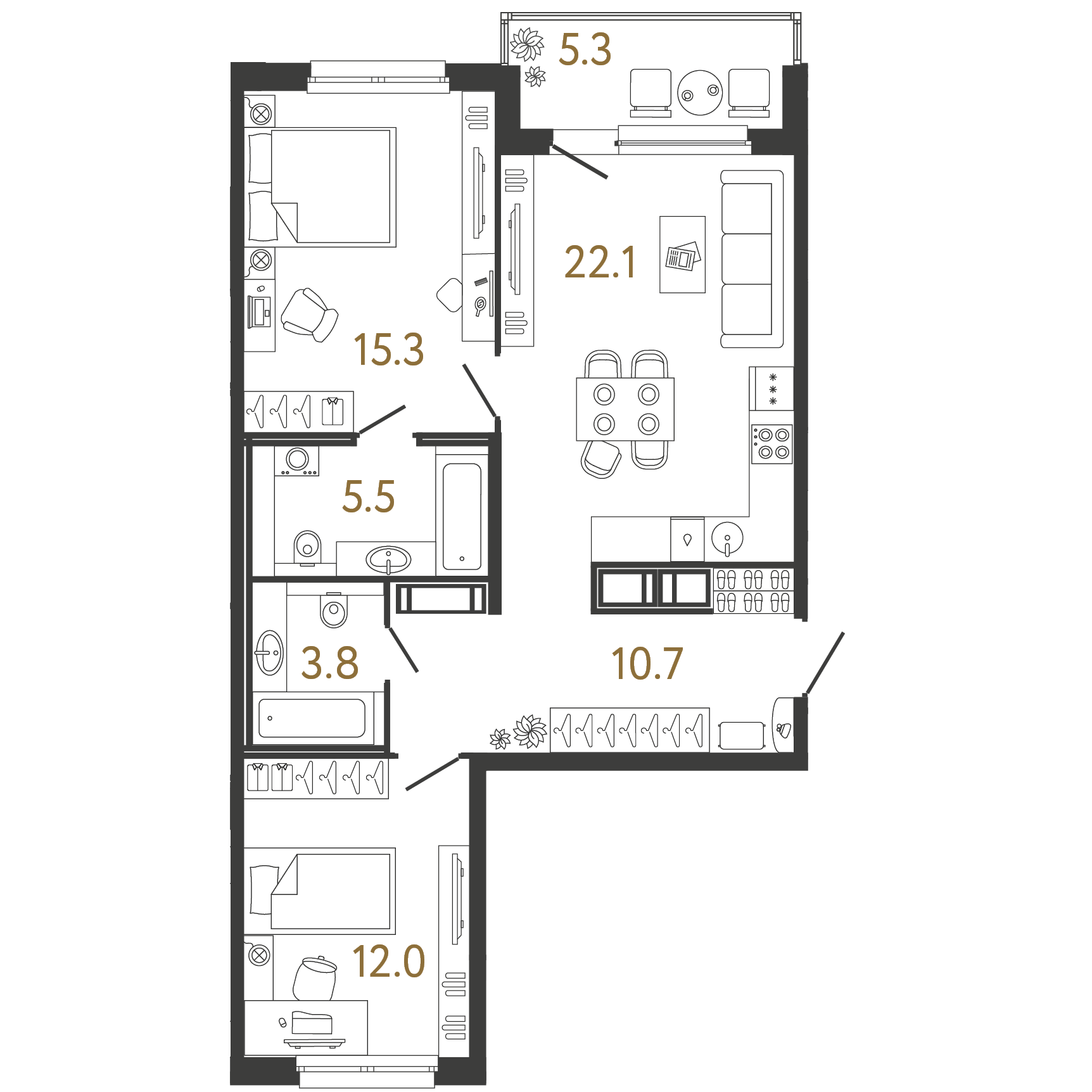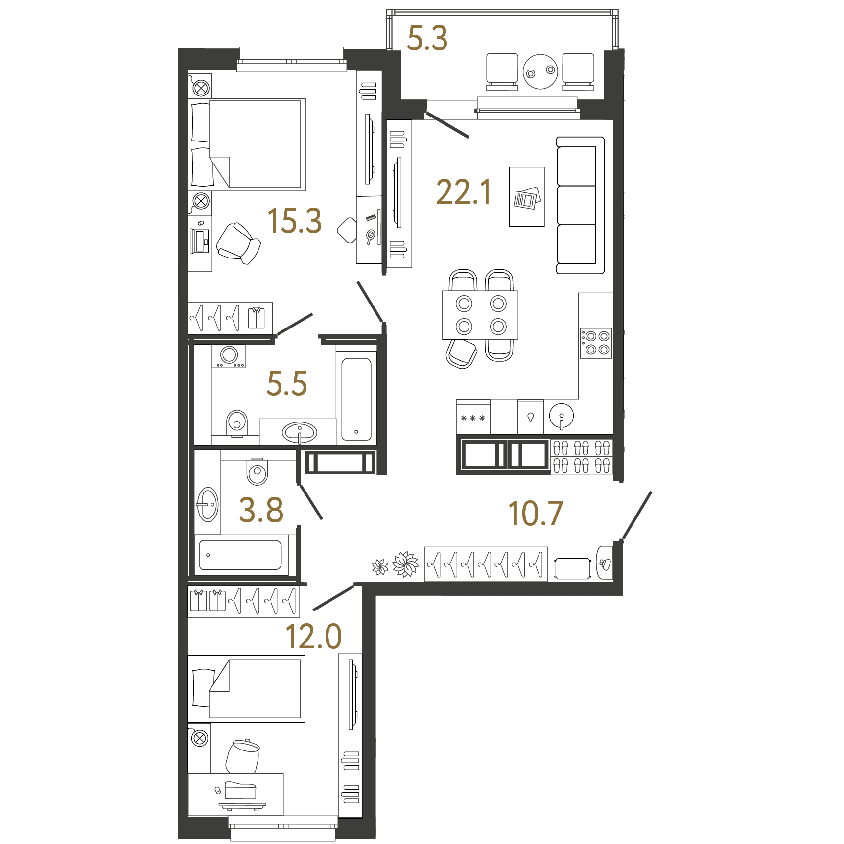 Площадь: 69.4 / 27.3 / 22.1