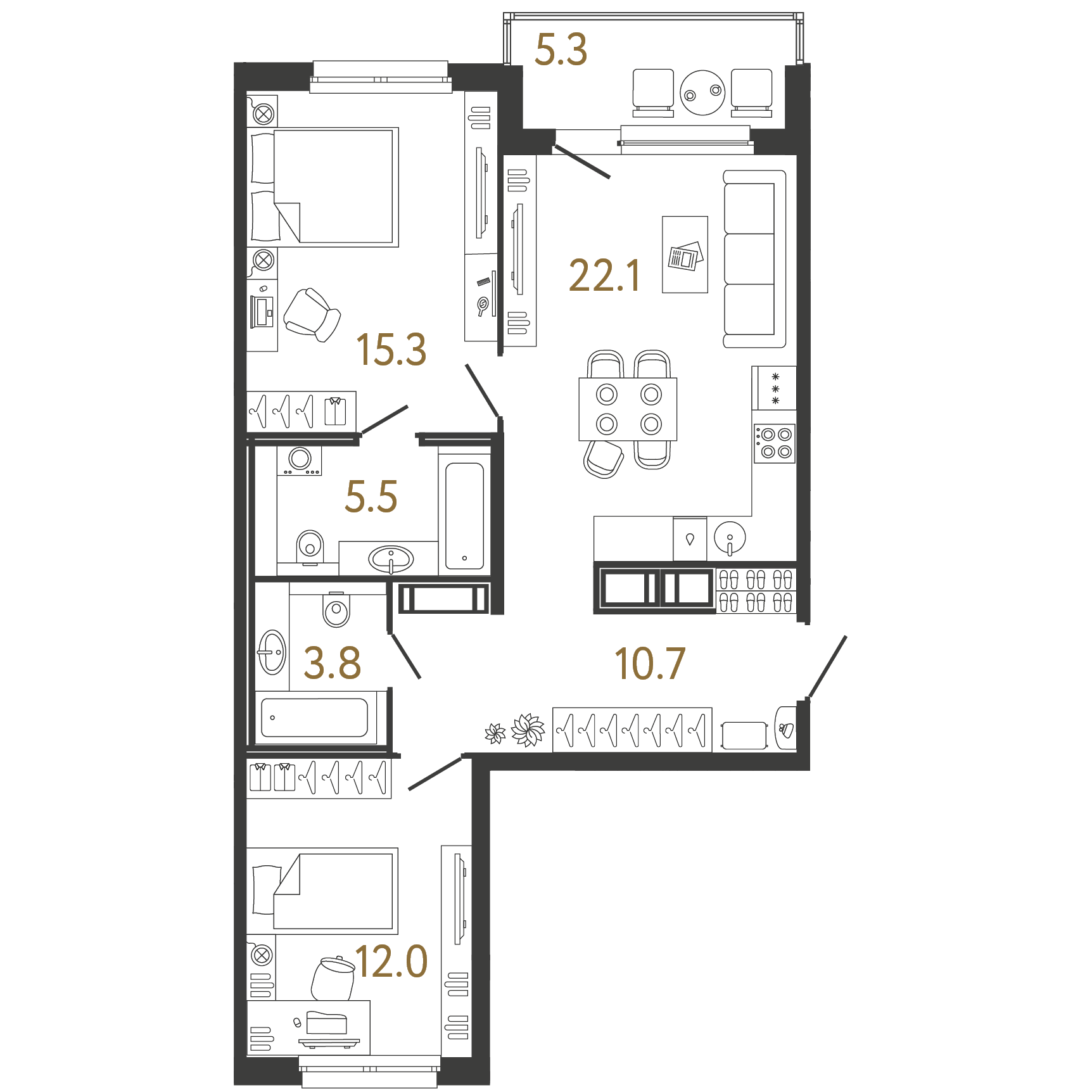 Площадь: 69.4 / 27.3 / 22.1