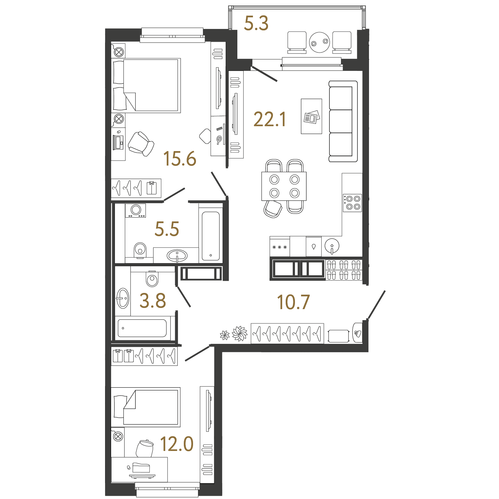 Площадь: 69.7 / 27.6 / 22.1