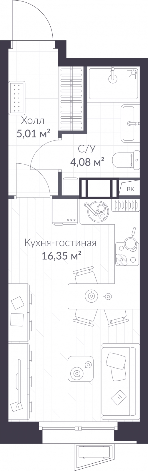 1-комн. квартира-студия в Veren Nort Сертолово на 3 этаже. Квартира без отделки, новый собственник может сделать ремонт по своему проекту. Общая площадь: 25.44 кв.м., площадь гостиной 16.35 кв.м., из которых 5 кв.м. выделено под кухонную зону. Все окна выходят на одну сторону. В квартире один совмещенный санузел. Высота потолков 2.82 м.