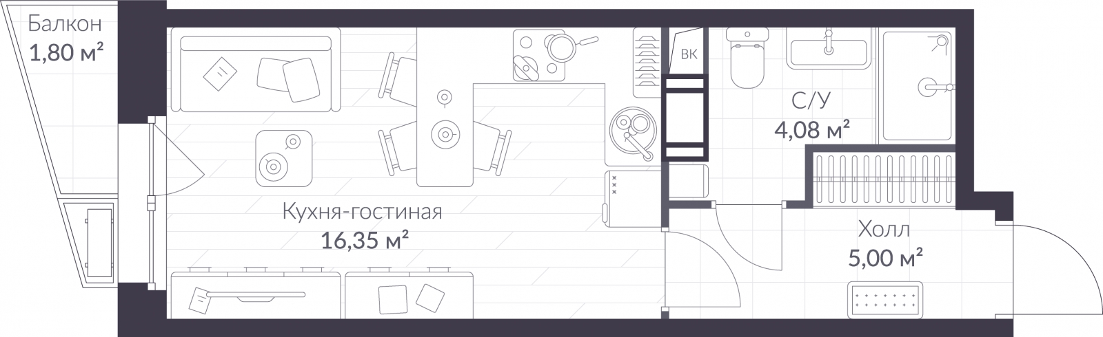Просторная однокомнатная квартира-студия в Veren Nort Сертолово на 6 этаже. Квартира без отделки, новый владелец может сделать ремонт по своему дизайн-проекту. Общая площадь: 25.97 кв.м., площадь гостиной 16.34 кв.м., из которых 5 кв.м. выделено под кухонную зону. Все окна выходят на одну сторону. В квартире один балкон, один совмещенный санузел. Высота потолков 2.82 м.