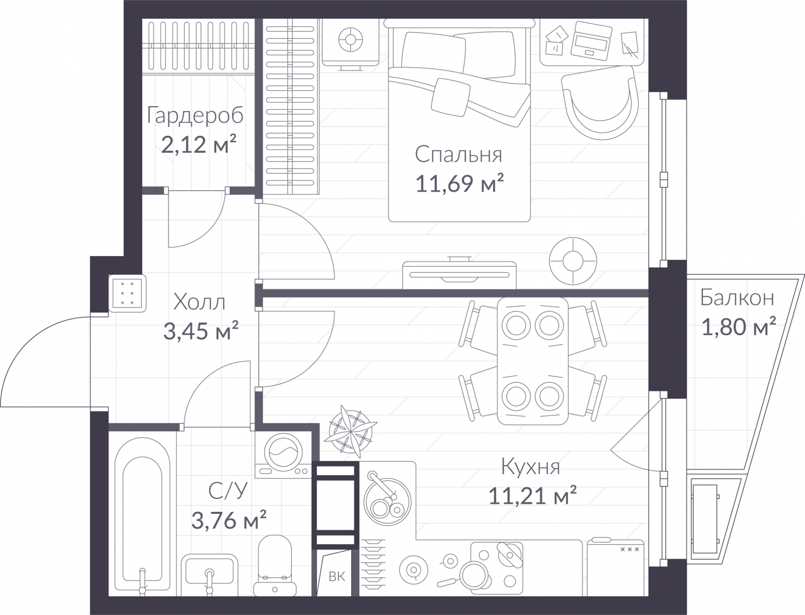 Просторная 1-комн. квартира в Veren Nort Сертолово на 9 этаже. Квартира без отделки, после оформления собственности можно делать ремонт. Общая площадь: 32.77 кв.м., жилая: 11.69 кв.м., площадь просторной куxни-гостиной: 11.21 кв.м. Все окна выходят на одну сторону. В квартире один балкон, один совмещенный санузел. Высота потолков 2.82 м.