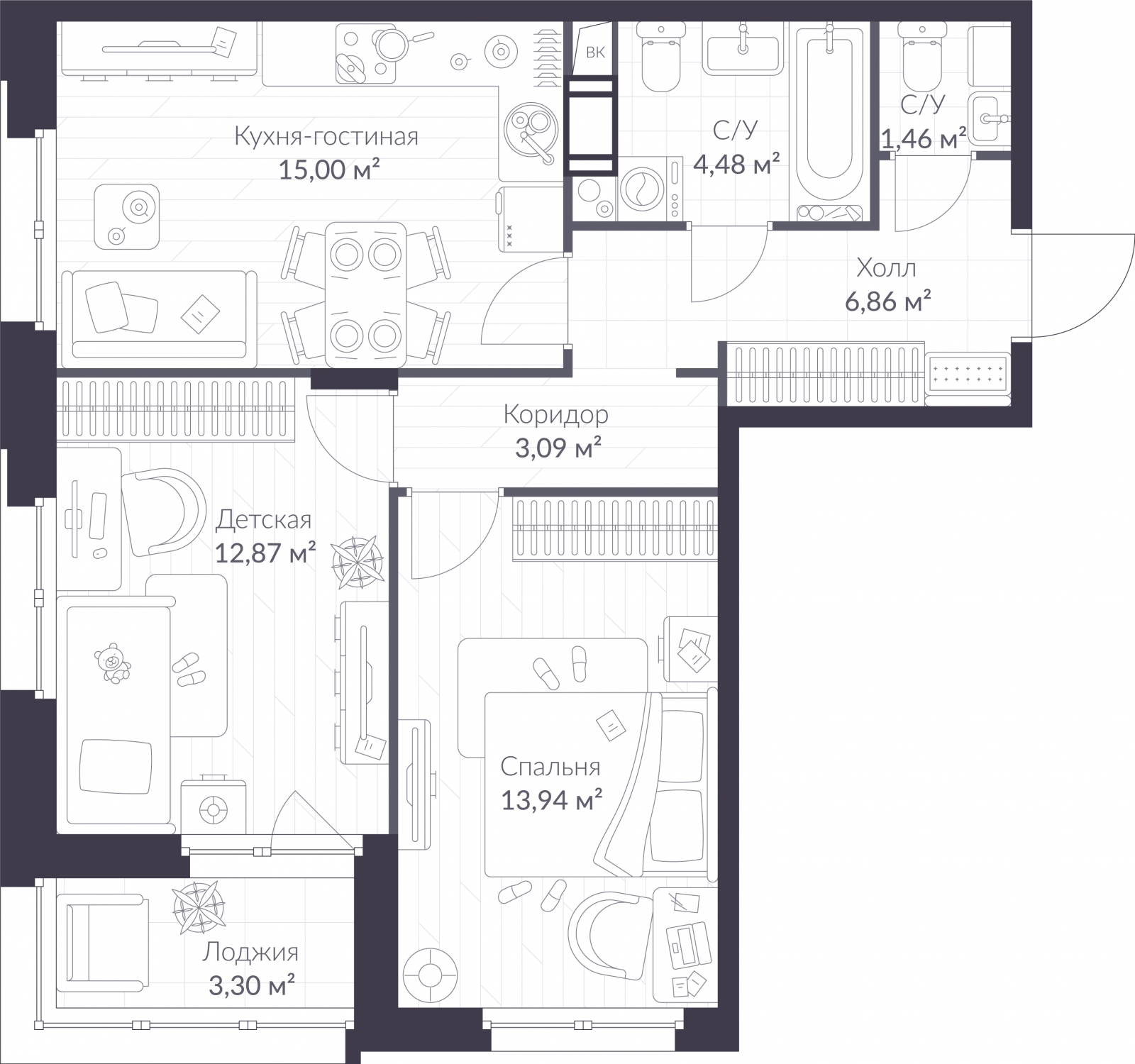 Двухкомнатная квартира от застройщика в Veren Nort Сертолово на 6 этаже. Квартира без отделки, после оформления собственности можно делать ремонт. Общая площадь: 59.35 кв.м., жилая: 26.87 кв.м., площадь просторной куxни-гостиной: 14.85 кв.м. Угловая квартира, окна oбecпeчивaют paвнoмepнoe ocвeщeниe в тeчeниe дня. В квартире одна лоджия, один совмещенный и один раздельный санузел. Высота потолков 2.82 м.