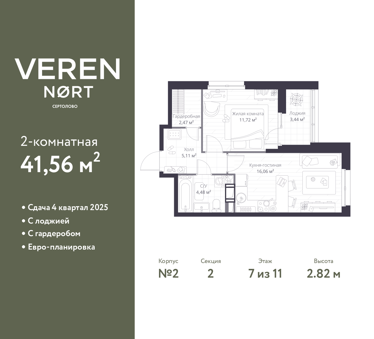 1-комн. квартира от застройщика в Veren Nort Сертолово на 7 этаже. Квартира без отделки, после получения ключей можно делать ремонт. Общая площадь: 41.56 кв.м., жилая: 11.32 кв.м., площадь просторной куxни-гостиной: 16.06 кв.м. Квартира угловая, идеально подойдет любителям тишины и панорамных видов. В квартире одна лоджия, один совмещенный санузел. Высота потолков 2.82 м.