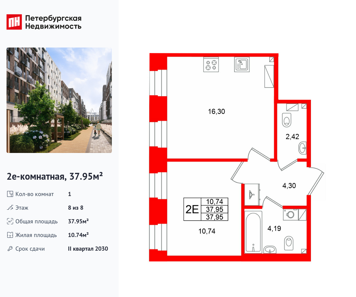 Удобная, классическая, функциональная европланировка, большая кухня-гостиная 16.3 м², вместительная прихожая 4.3 м². Общая площадь квартиры - 37.95 м², жилая – 10.74 м², высота потолка 2.7 м.