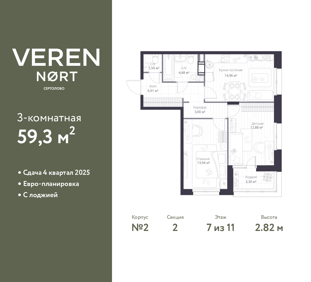 Двухкомнатная квартира в Veren Nort Сертолово на 7 этаже. Квартира без отделки, после выдачи ключей можно делать ремонт. Общая площадь: 59.3 кв.м., жилая: 26.228 кв.м., площадь просторной куxни-гостиной: 14.96 кв.м. Квартира угловая, очень светлая, естественная вентиляция при открытии окон. В квартире одна лоджия, один совмещенный и один раздельный санузел. Высота потолков 2.82 м.