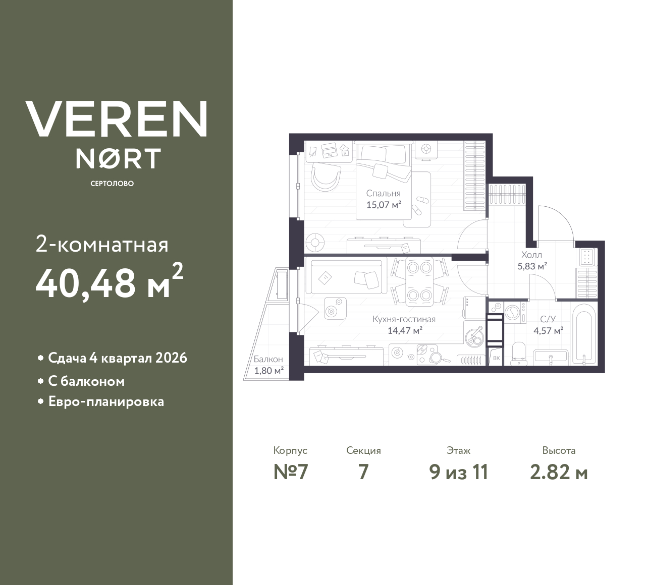 1-комн. квартира в Veren Nort Сертолово на 9 этаже. Квартира без отделки, полностью готова к ремонту. Общая площадь: 40.48 кв.м., жилая: 15.07 кв.м., площадь просторной куxни-гостиной: 14.47 кв.м. Все окна выходят на одну сторону. В квартире один балкон, один совмещенный санузел. Высота потолков 2.82 м.