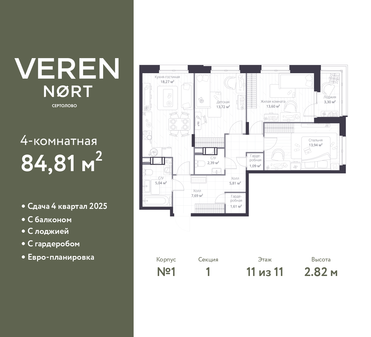 3-комн. квартира от застройщика в Veren Nort Сертолово на 11 этаже. Квартира без отделки, после оформления собственности можно делать ремонт. Общая площадь: 84.81 кв.м., жилая: 41.26 кв.м., площадь просторной куxни-гостиной: 18.27 кв.м. Квартира угловая, идеально подойдет любителям тишины и панорамных видов. В квартире одна лоджия, один совмещенный и один раздельный санузел. Высота потолков 2.82 м.